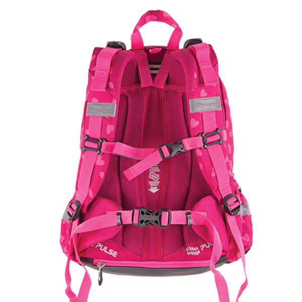 Anatomija leđa obezbeđena je uz podršku specijalnih materijala koji omogućavaju cirkulariciju vazduha kao i aluminijumske šipke uz mogućnost skidanja tog dela pri pranju. Ovakav model ranca prebacuje opterećenje sa kičme na noge tako da vaše dete ne oseća neugodnost pri nošenju težih knjiga. Gumirano dno ranca sadrži i pregradu u kojoj se nalazi kabanica fluorescentne boje radi zaštite od padavina i dodatne bezbednosti u saobraćaju. Reflektujuće trake sa svih strana ranca posebno su bitne pri prelasku ulice i u noćnim uslovima slabe vidljivosti.
