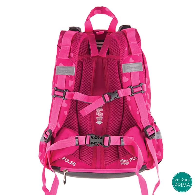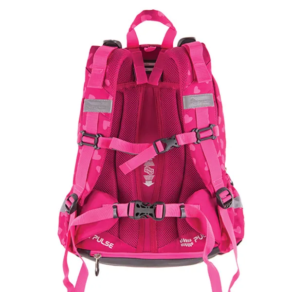 Anatomija leđa obezbeđena je uz podršku specijalnih materijala koji omogućavaju cirkulariciju vazduha kao i aluminijumske šipke uz mogućnost skidanja tog dela pri pranju. Ovakav model ranca prebacuje opterećenje sa kičme na noge tako da vaše dete ne oseća neugodnost pri nošenju težih knjiga. Gumirano dno ranca sadrži i pregradu u kojoj se nalazi kabanica fluorescentne boje radi zaštite od padavina i dodatne bezbednosti u saobraćaju. Reflektujuće trake sa svih strana ranca posebno su bitne pri prelasku ulice i u noćnim uslovima slabe vidljivosti. . Detaljnije