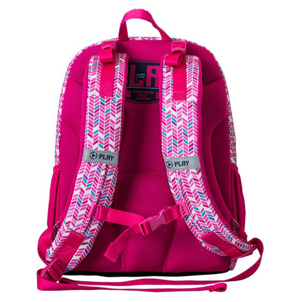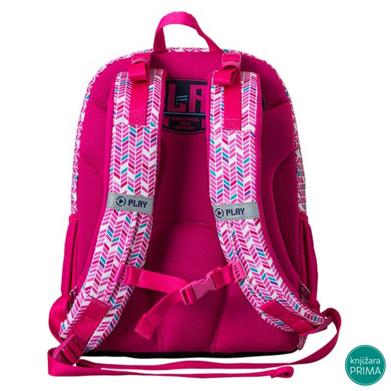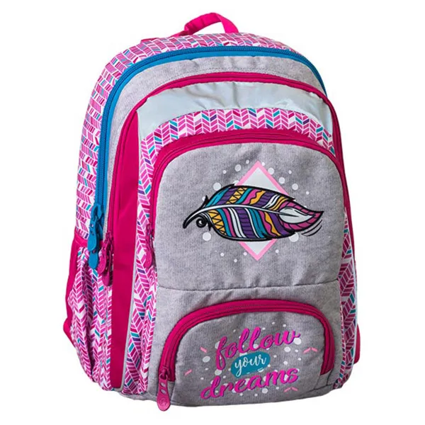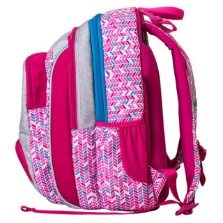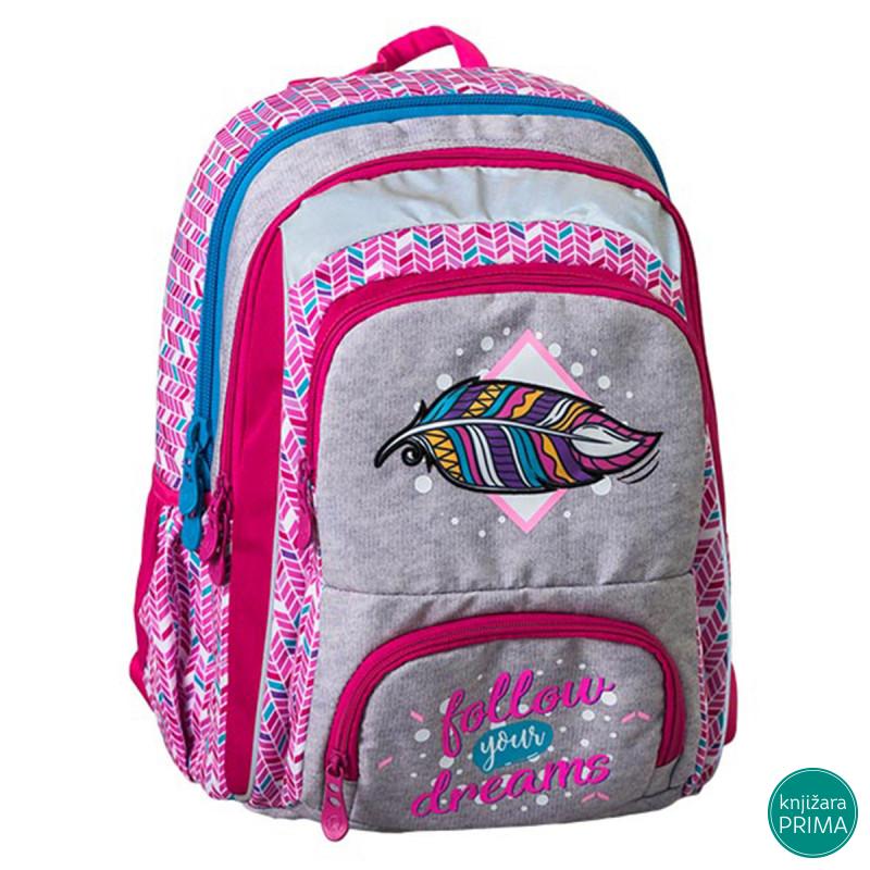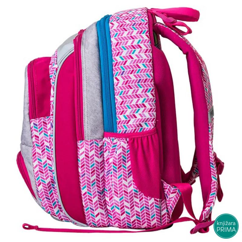 Samostojeći, triput opšiveni, vodootporna tkanina, visokokvalitetni poliester, reflektujuće bezbednosne trake, ramenice u obliku banane, podesive ramenice, distributeri težine na ramenicama, lagan i izdržljiv, džepovi sa strane, anatomski oblikovana ventilirajuća mrežasta leđa, štampana postava. Organizator u prednjem džepu.