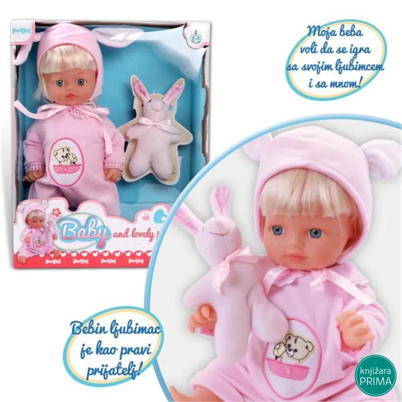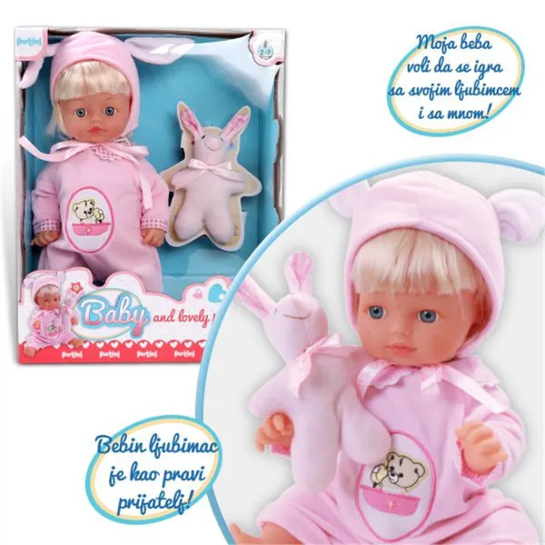 Set sadrži lutku i životinju - ljubimca koji su izradeni od mekanih kvalitetnih materijala. Lutka je obucena u roze odelo sa kapicom sa ušima. Dim: 32x38x12 cm. Uzrast: 2-7god . Detaljnije
