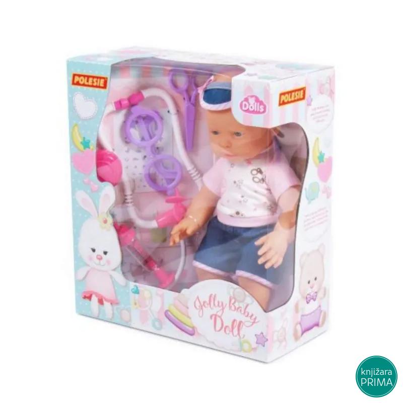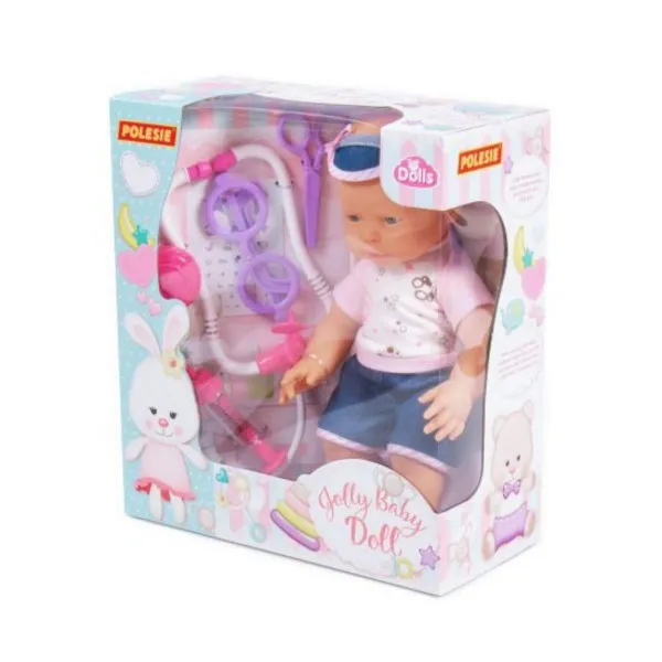 Igračka je napravljena od visokokvalitetnih materijala, oči lutke se ne zatvaraju. Beba lutka je obučena u elegantno odelo, kao prava beba. Paket uključuje set od 4 elementa: naočare, špric, makaze i stetoskop.