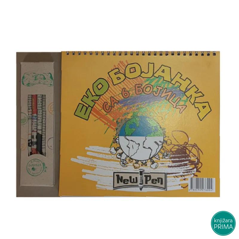 Ekološka bojanka + pakovanje od 6 bojica od recikliranog papira NewPen grafitne olovke i bojice su napravljene od recikliranog novinskog i drugog recikliranog papira. Ovakav način proizvodnje olovaka i bojica u prvi plan stavlja zaštitu životne sredine i to na sledeći način: Očuvanjem šuma: ne koristi se drvo - ne seče se drveće čime se usporava proces globalnog zagrevanja i ne stvara se otpad Reciklažom: reciklirani papir se koristi u proizvidnji Ponovnom upotrebom: već upotrebljeni reciklirani novinski papir sada dobija novu primenu u olovkama Svaka bojica je unikat! Ekološki proizvod napravljen u Srbiji.