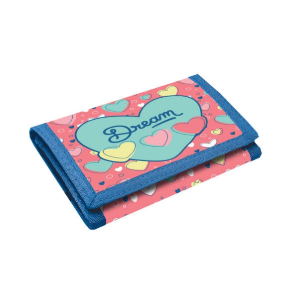 Dečiji novčanik sa čičak trakom. Ima pregradu za papirni novac, džep za sitan novac, džep za kartice i mesto da se zakači ključ.