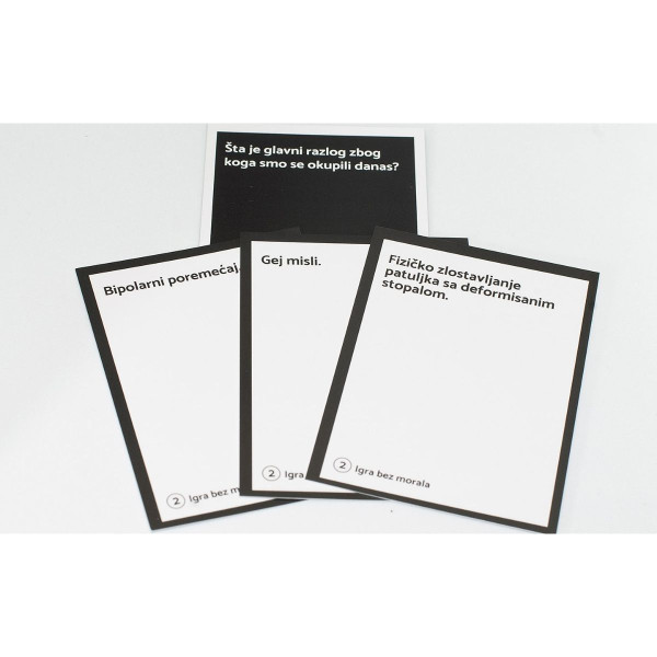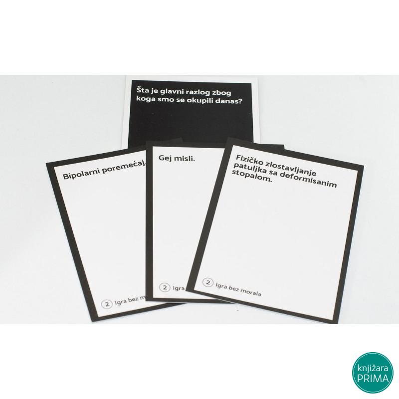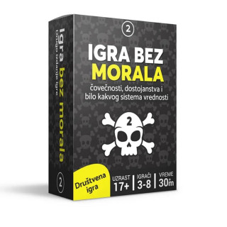 Igra bez morala 2 je bizarna i zabavna društvena igra usmerena protiv čovečnosti, dostojanstva i bilo kakvog sistema vrednosti. Za razliku od ostalih grupnjačkih – čitaj društvenih igara, koje ste igrali ranije, Igra bez morala je toliko lascivna i nastrana koliko ti i tvoji prijatelji zajedno. Pred vama je igra koja podseća na igru koja je osvojila ceo svet ali uz ličnu recenziju samih kreatora, koji su nevidjeno užasni, ipak smo birali sam krem beskrupuloznih ljudi regiona, da bi bilo u potpunosti novo što je nekada kružilo našim tržištem. Prilike za igru su razne, može se svakodnevno konzumirati, potrebno je minimum 3 učesnika.