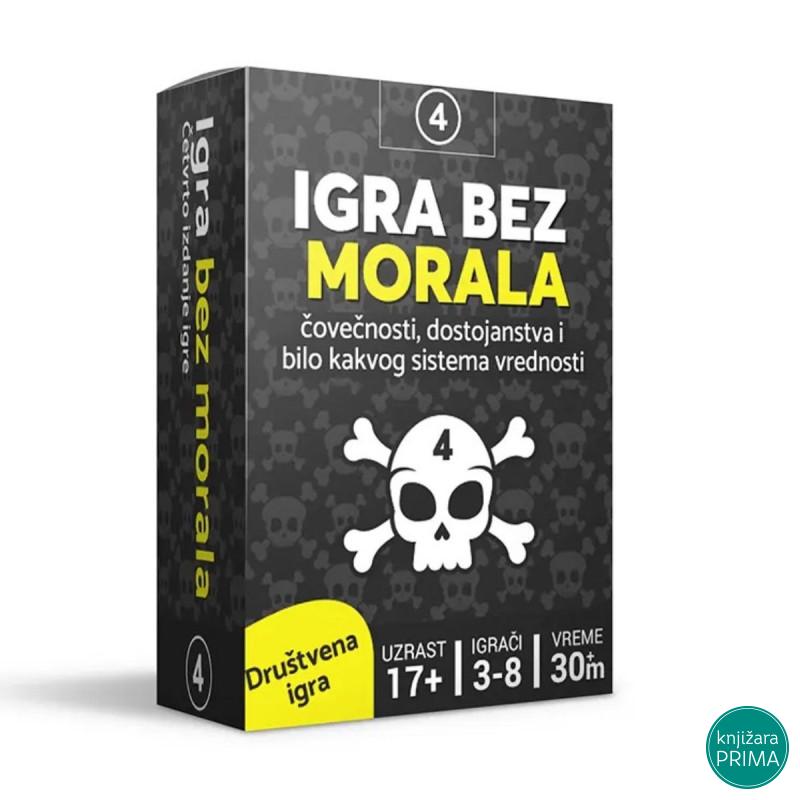 gra bez morala 4 je bizarna i zabavna društvena igra usmerena protiv čovečnosti, dostojanstva i bilo kakvog sistema vrednosti. Za razliku od ostalih grupnjačkih – čitaj društvenih igara, koje ste igrali ranije, Igra bez morala je toliko lascivna i nastrana koliko ti i tvoji prijatelji zajedno. Pred vama je igra koja podseća na igru koja je osvojila ceo svet ali uz ličnu recenziju samih kreatora, koji su nevidjeno užasni, ipak smo birali sam krem beskrupuloznih ljudi regiona, da bi bilo u potpunosti novo što je nekada kružilo našim tržištem. Prilike za igru su razne, može se svakodnevno konzumirati, potrebno je minimum 3 učesnika.