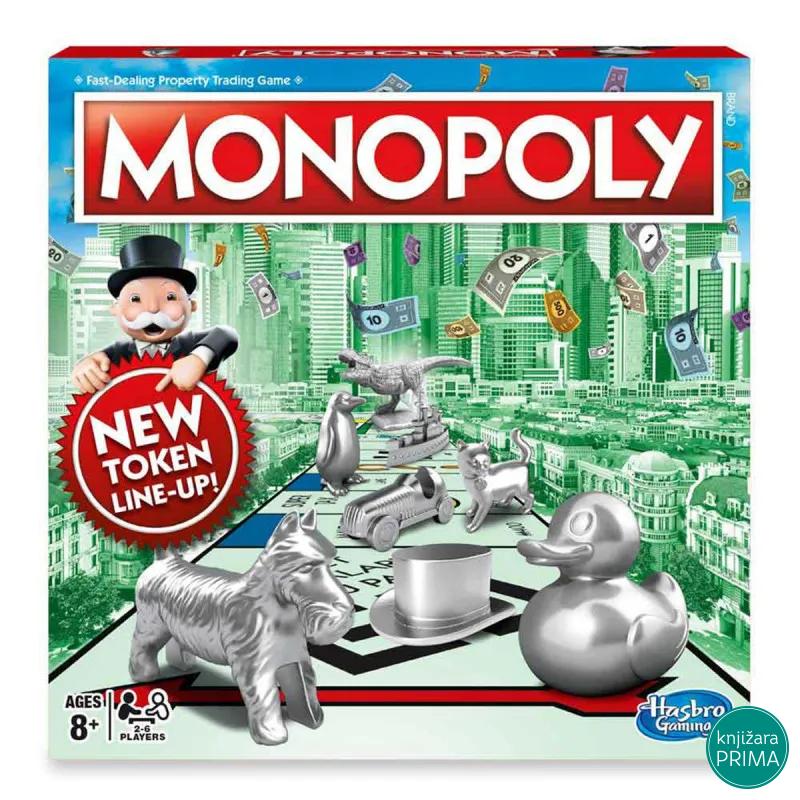 Klasična društvena igra namenjena zabavi za celu porodicu! Kreći se po tabli kupuj posede gradi kuće i hotele a potom naplati pristup svim posetiocima! Oprobaj sve šanse razvij infrastrukturu i osvoji ceo svet! U novom Monopolu čekaju te nove figurice - maca kuca patkica pingvin dinosaurus brod i automobil! Uzrast: 8+ godina Materijal: plastika karton papir Dimenzije: 27 x 27 x 5 cm Set sadrži: tablu 8 figurica 28 kartica ugovora po 16 šansi i iznenadjenja 32 kuće 12 hotela 2 kocke novac i uputstvo
