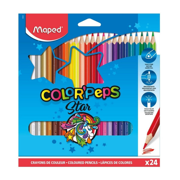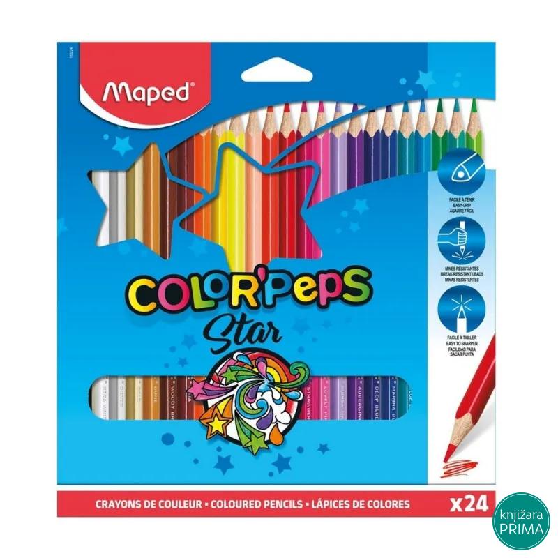 Drvene bojice Maped Color Peps u pakovanju od 24 komada. Bojice su trouglaste, lako se režu, ostavljaju intenzivan trag debljine 2,9 mm.