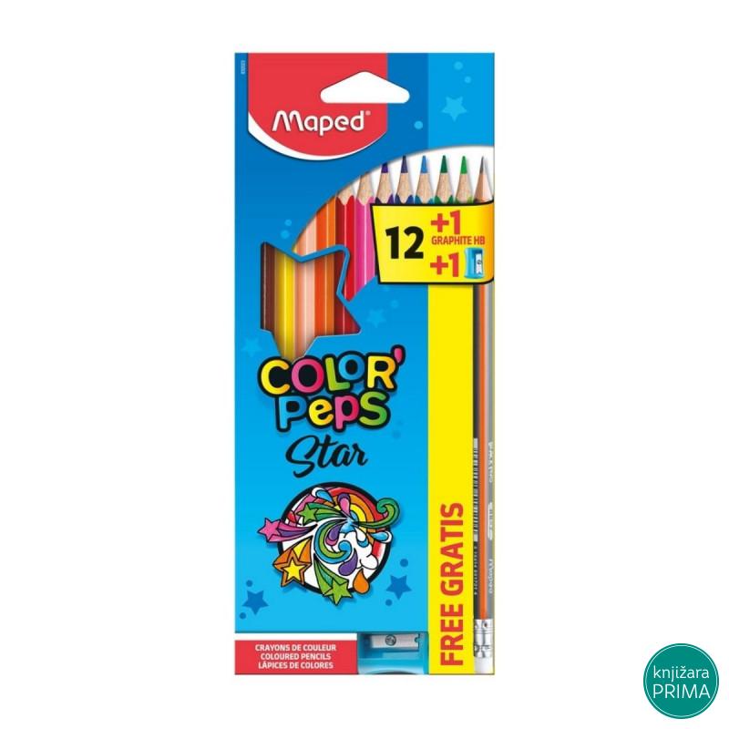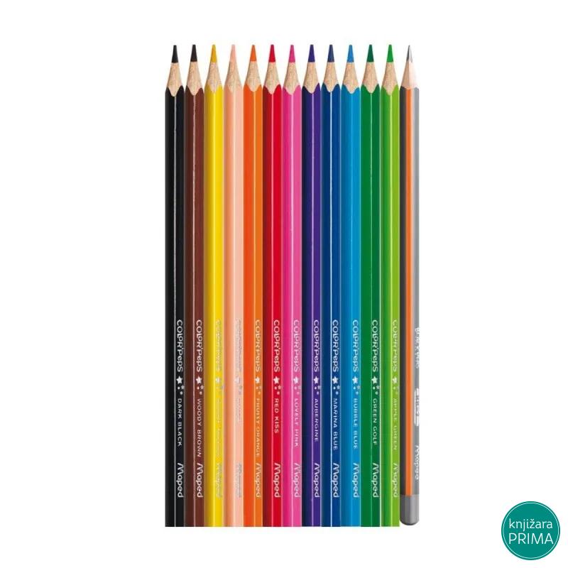 Drvene bojice brenda MAPED sa gratis grafitnom olovkom i zarezačem. Bojice su trouglastog oblika i intenzivnih boja.
