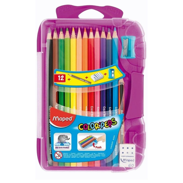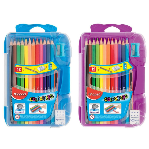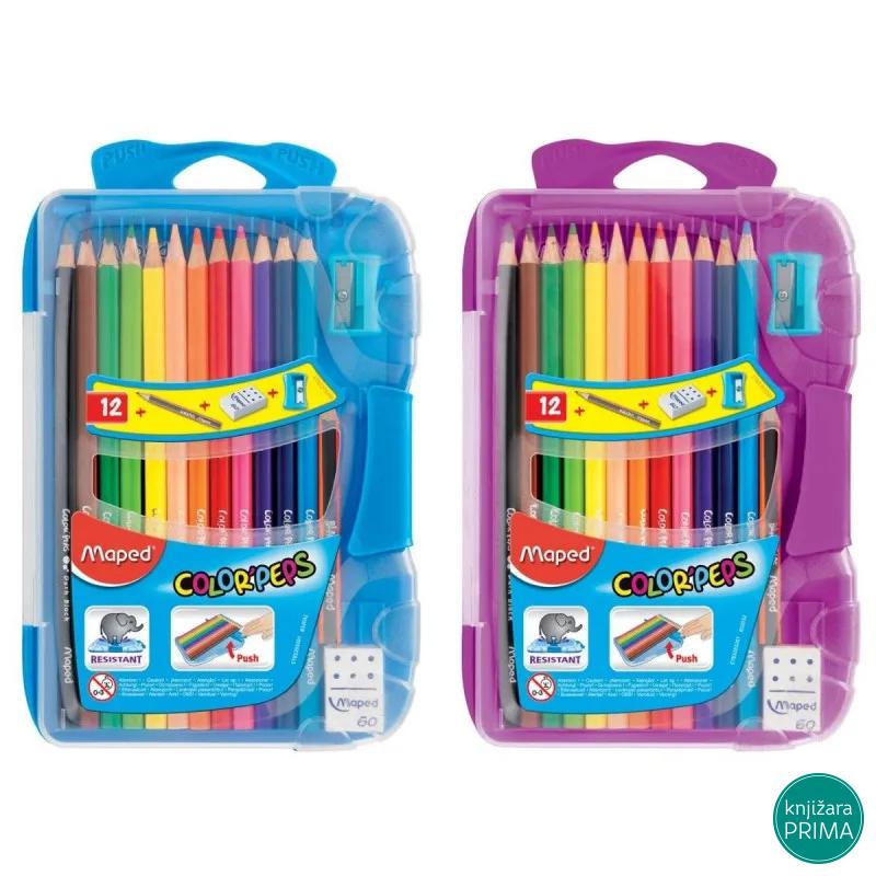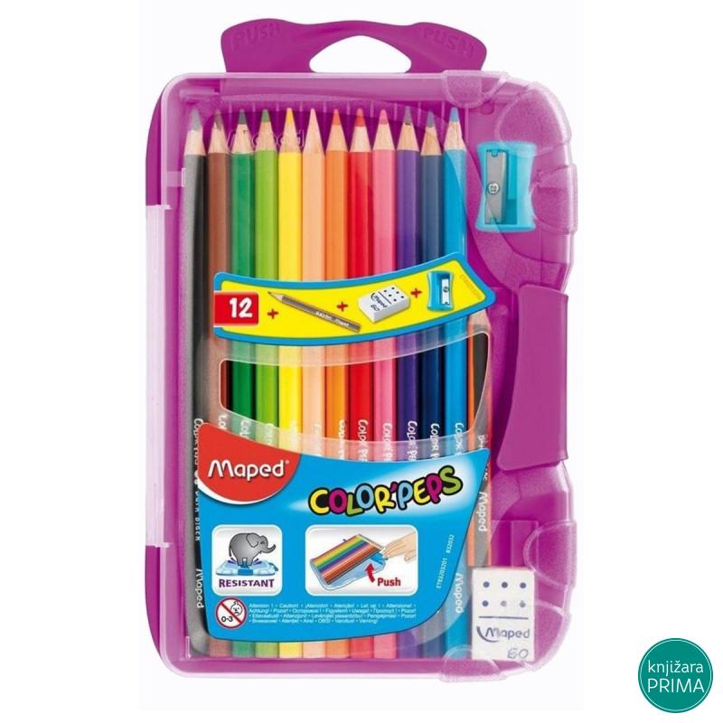 Drvene bojice Mapes Color Peps u PVC kutiji koja dolazi upravoj i roze boji. Osim 12 drvenih bojica u kutiji se nalaze i Maped gumica, zarezač i HB grafitna olovka.