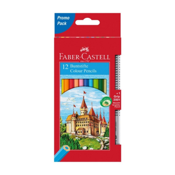 Drvene bojice Faber Castell , kartonsko pakovanje od 12 komada. Klasične bojice, standardne veličine i oblika sa gratis grafitnom olovkom Grip. Odlikuju se jarkim, pigmentovanim bojama i posebnim postupkom lepljenja, što povećava otpornost na lomljenje mine.