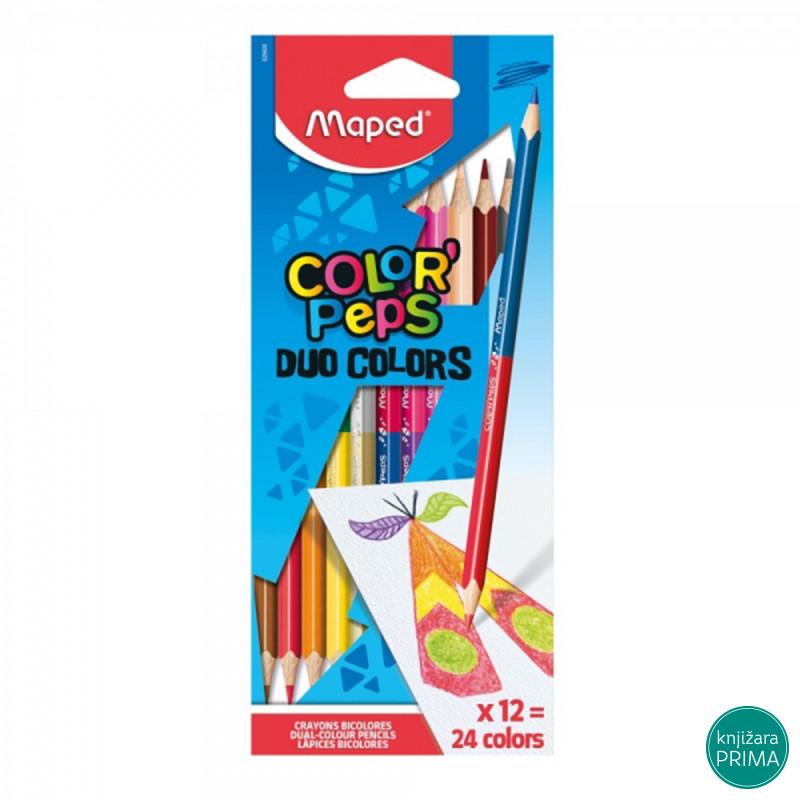 Drvene bojice MAPED COLOR PEPS DUO Dve bojice u jednoj Intenzivne boje Otporan vrh debljine 29 mm Trouglasti oblik bojice 24 boje na 12 bojica u pakovanju