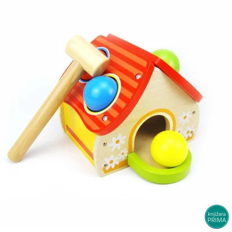 Sjajna igračka za vežbe motorike ruke i koordinaciju „oko-ruka“ - ToP BRIGHT Kućica sa čekićem i lopticama podstiče dečiju znatiželju i pruža osećaj sreće i zadovoljstva. Prvenstveno zato što dete uživa u rezultatima svoje aktivnosti – lupanju i ubacivanju loptica kroz otvore sopstvenom snagom. Dete ima zadatak da postavi lopticu na otvor krova kućice iste boje kao što je i loptica i udarajući čekićem ubaci je u kućicu. Sreća je upotpunjena i „magičnim“ izlaskom loptice kroz vrata kuće. Buka koja se stvara prilikom udaranja čekića o loptice nije velika a kod deteta izaziva sreću i motiviše ga da to radi i dalje. Na jednoj strani drvene kućice nalazi se drveni cvet koji može da se navije a potom se rotira i proizvodi zvuke zupčanika (cak cak cak). Osnovne odlike igračke su: -kvalitetno drvo fino obrađenih elemenata; -četiri drvene loptice i čekić; -praktična za odlaganje i čuvanje; -sigurne boje na bazi vode; -simpatične ilustracije vedrih boja; -odlična za razvoj motoričkih osobina. Uz ToP BRIGHT Kućicu sa čekićem i lopticama dete: -razvija finu motoriku -razvija koordinaciju „oko-ruka“ -uči boje; -unapređuje preciznost; -upoznaje vezu „radnja-posledica“. U periodu kada dete ima potrebu da isprobava razne aktivnosti od kojih su mnoge praćene lupanjem – ponudite mu ToP BRIGHT Kućicu sa čekićem i lopticama i njegovu znatiželju pretvorite u korisnu igru.. Detaljnije