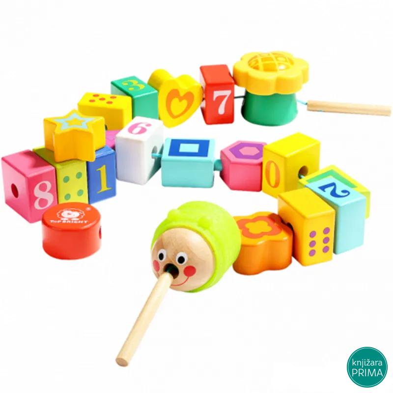 Evo sjajne igračke za vežbe fine motorike u obliku gusenice! 20 šarenih drvenih elemenata i kanap za nizanje ToP BRIGHT Edukativne igračke – Naniži gusenicu zabaviće dečije prstiće i pažnju i razviti nove veštine. Dete ima zadatak da na kanap niže elemente proizvoljnim ili smislenim redosledom i tako oblikuje telo šarene gusenice. Elementi sadrže određene ilustracije koje mogu (i ne moraju) određivati redosled slaganja (po brojevima tufnicama) u zavisnosti od uzrasta deteta. Osnovne odlike igračke su: -kvalitetno drvo fino obrađenih elemenata; -sigurne boje na bazi vode; -mnoštvo drvenih elemenata za nizanje; -za razvoj fine motorike i intelektualnih osobina dece; -učenje boja i brojeva; -učenje 3D geometrijskih oblika. Uživajte u nizanju gusenice i vežbama koje unapređuju intelektualni razvoj dece. Dimenzije: 237 x 20 x 35 cm. Detaljnije