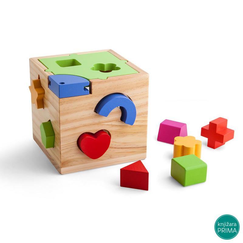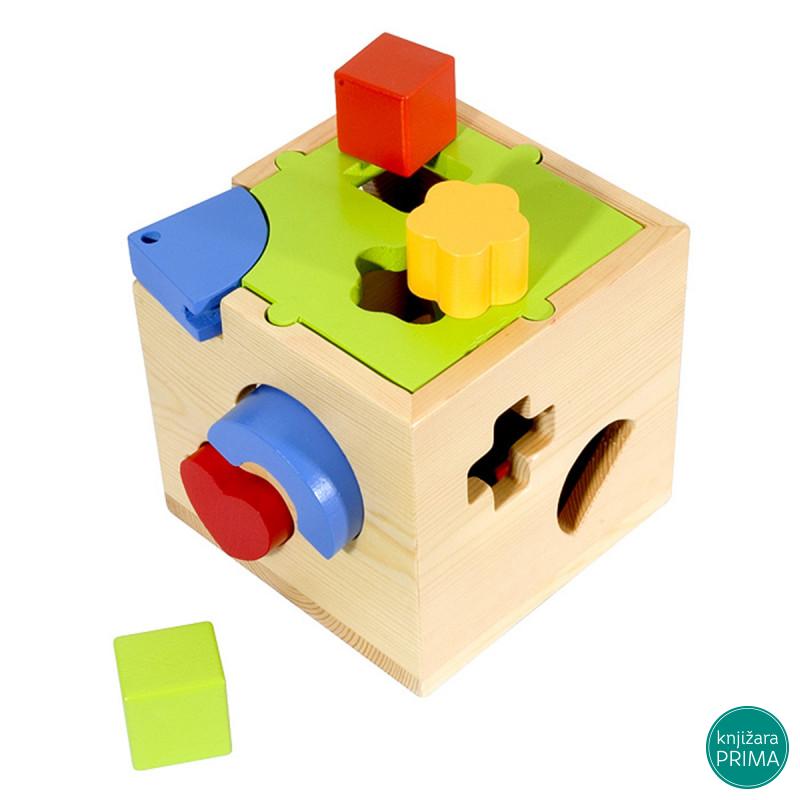 Dete u svakom trenutku uči i stvara svest o naučenome. I kad je još sasvim malo kad mislimo da nije važno kako i čime se igra ono upija i uči na svojim pokušajima na svom iskustvu. Zadatak koje se pred detetom nalazi prilikom igre didaktičkom kockom je da određene elemente ubaci u za to predviđene otvore. Pre toga moraće da uoči oblik na kocki i onaj koji drži u ruci. Manja deca će prvo rešavati zadatak metodom pokušaja i pogrešaka pokušavaće da krug ubace u otvor predviđen za zvezdu čak će i biti jako ljuti ako im to ne uspe. Na taj način deca stiču pravo iskustvo kako bi lakše razumeli svet oko sebe. U toku igre učiće o relacijama u i van ispred ili iza manje ili više – “puno delova sam ubacio u kocku van nje ih ima manje”. Dok ubacuje elemente u otvore dete će morati da ih rotira i na taj način razvija sitnu motoriku i koordinaciju oko-ruka. Didaktička kocka podstiče zajedništvo i sposobnost komuniciranja matematičke i logičke igre sposobnost razmišljanja ali i vode dete u avanturu. Kroz misaone i praktične aktivnosti dete posmatra upoređuje istražuje isprobava i proverava svoje pretpostavke. A kada prvi put sve elemente uspešno ubaci u kocku biće veoma srećno i ponosno na sebe. Sastoji se od drvene kutije i 12 različitih elemenata. Dimenzije: 15.5×15.5×15.5 cm Preporučen uzrast: za decu stariju od 18 meseci.