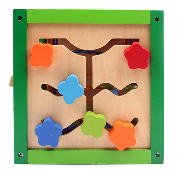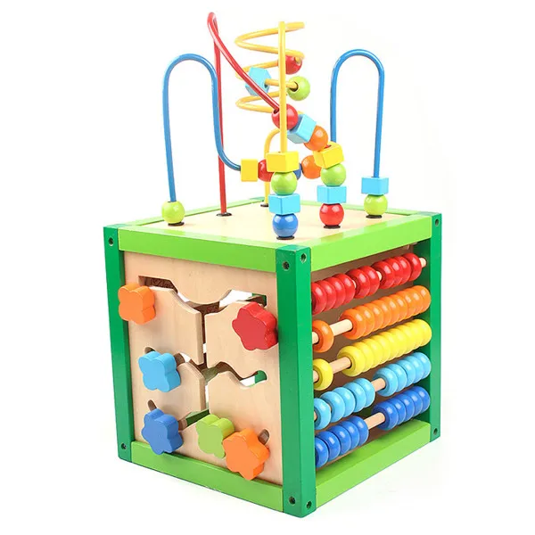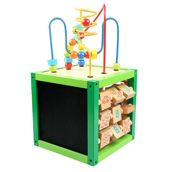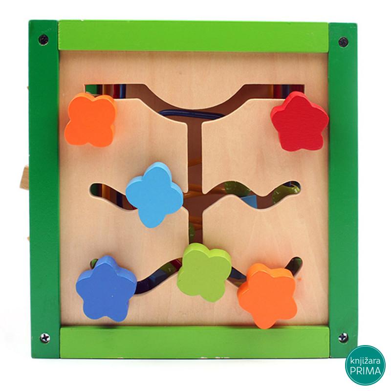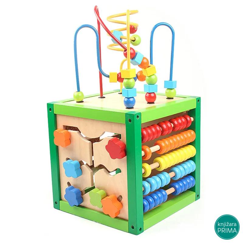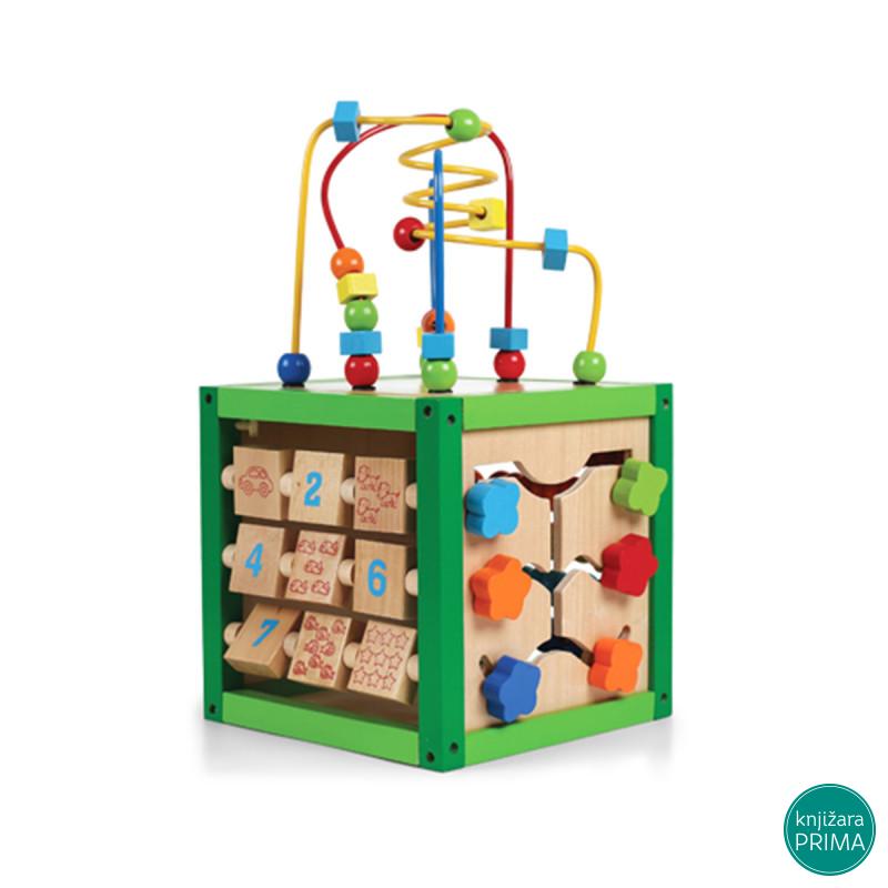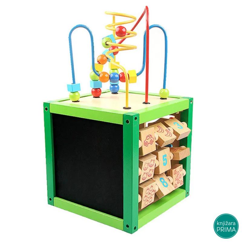 Aktiviti kocka je igračka podeljena na više celina. Svaka celina je poseban stimulans i obezbeđuje razne mogućnosti individualizovanog oblika rada. Pogodna je i ako imate decu različitog uzrasta jer je tempo učenja primeren pojedincu. Svaka aktivnost pospešuje koncentraciju i polako osvešćuje logičke postupke. Deca sa ovom kockom beskrajno istražuju i otkrivaju osobine i odnose stvari igrajući se koordinišući različite akcije i šeme. Dete uvek ponovo uči i to na nov način. Deo igračke je put za perle koji je osmišljen tako da daje mogućnost detetu da ih pomera krivolinijski i spiralno. Perle su u obliku geometrijskih figura pa deca uočavaju njihove karakteristike u prostoru. Aktivno u procesu učenja dete razvija fizička saznanja o geometrijskim oblicima i linijama (boja oblik veličina tvrdoća…) i logička saznanja (osobine do kojih je dete došlo rešavajući neki problem). Preko računaljke može se kod deteta inicirati formiranje pojma broja. Ona mu pruža da prođe sve faze u savladavanju brojanja (dete prvo broji premeštanjem predmeta koje broji zatim njihovim dodirivanjem nakon čega prstom pokazuje ono što broji i na kraju uspeva da prebroji samo posmatranjem). Dete broji i upoređuje dodaje i oduzima i utvrđuje koliko čega ima. Uspeh u učenju sabiranja i oduzimanja zavisi od metode koja je upotrebljena i od broja ponavljanja. Upravo računaljka obezbeđuje sve uslove za pravilno savladavanje ovih operacija. Jedna strana kocke je osmišljena tako da dete kroz igru uvede u numeričku simbolizaciju. Sa jedne strane dete će da se trudi da prebroji tačan broj ilustrovanih elemenata a sa druge strane videće kako se piše cifra koja pokazuje brojnost tih elemenata. Na ovoj strani dete će uspeti da uoči i brojevni niz kao i da dođe do zaključka da pri brojanju broj koji je poslednji izbrojan ustvari predstavlja ukupan broj izbrojanih elemenata. Na tabli za pisanje dete će otkriti da svojim pokretima može da ostavlja tragove. To će mu biti zabavno pa ukoliko mu ponudite krede i sunđer koristiće ih stalno i tako vežbati pokrete žvrljanja kasnije pisanja i crtanja. Dimenzije: 20x20x20 cm Preporučen uzrast: za decu stariju od 2 godine.