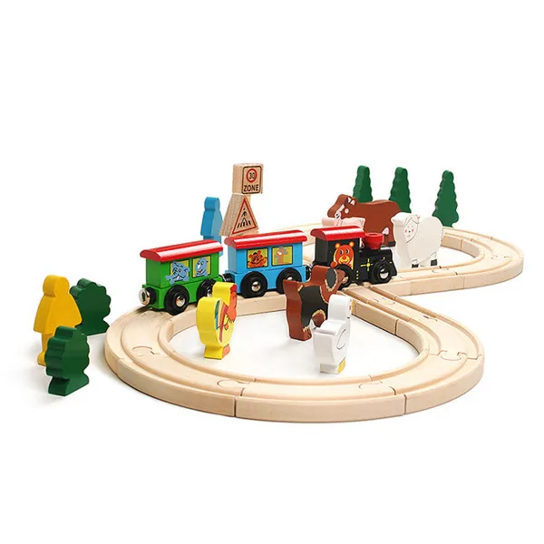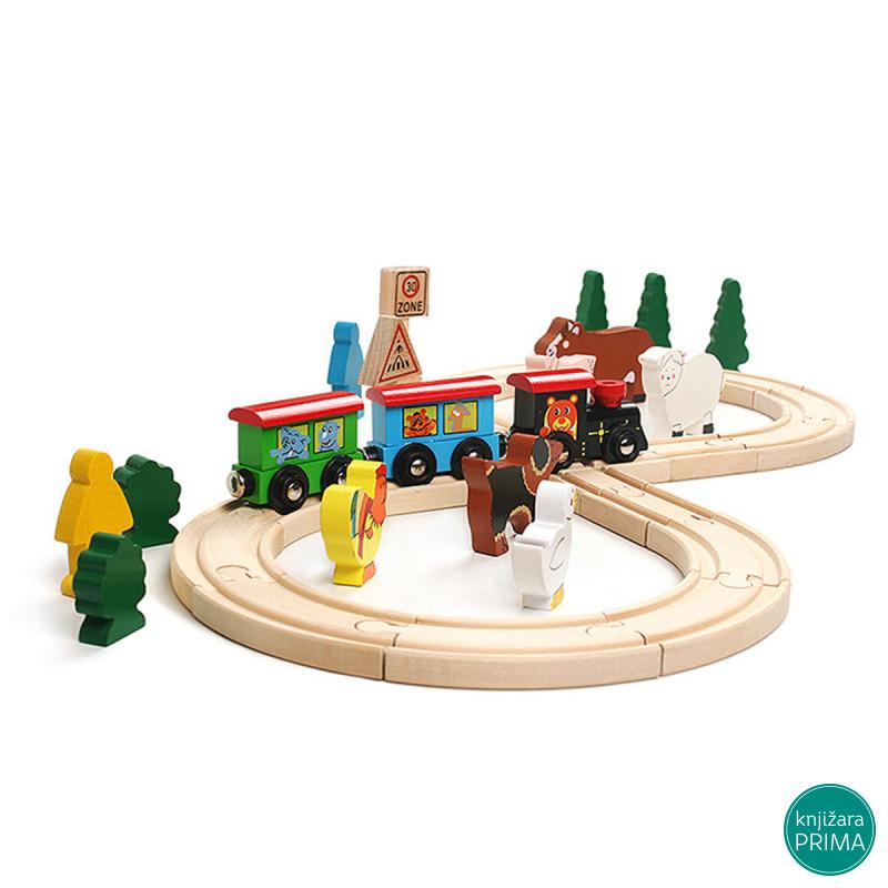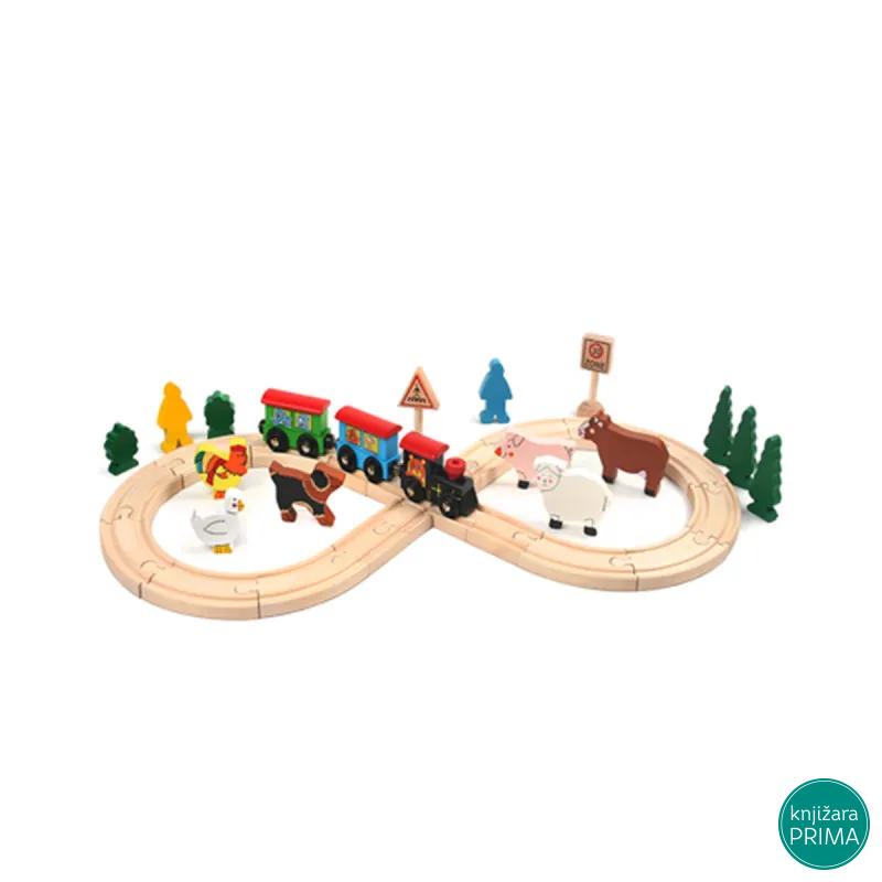 Ovo je igračka namenjena igrama mašte i uloga ali zahteva snalažljivost u sklapanju delova u jednu veliku celinu. Naime prvi zadatak deteta jeste da „izgradi“ prugu od odgovarajućih elemenata. Zatim mora da napravi voz koga čine lokomotiva i dva vagona. Postavljanje eksterijera poslednji je korak u pripremama za početak velikog putovanja. Ovo je omiljena igra dečaka ali to nikako ne znači da devojčicama ne treba ponuditi mogućnosti igranja sa ovom igračkom niti dečacima treba zabraniti lutke. Ukoliko se odrasli umešaju u igru neka to bude u smislu pomoći da se osmisli početak kraj i cilj putovanja. Pored mašinovođe u vozu mogu da se nađu i različiti putnici od kojih jedan žuri drugi spava treći nosi poklone nekome ko mu jedrag četvrti se izgubio i želi da se vrati kući i sl. Pomozite detetu da osmisli različite uloge i igrajte se zajedno sa njim. Dimenzije pruge: 57×25.5×1.2 cm Preporučen uzrast: za decu stariju od 3 godine.