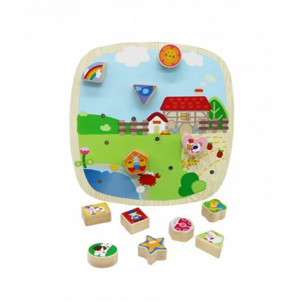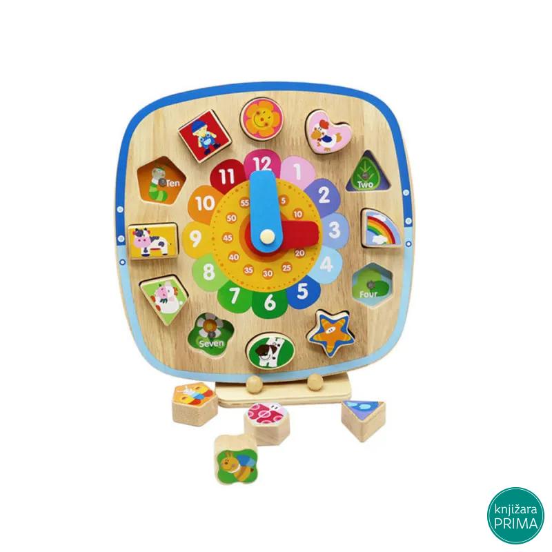 Igračka kojom se igraju mala i velika deca istovremeno. učenje pojmova vežbe fine motorike razvoj preciznosti pokreta učenje brojeva brojevnog niza učenje gledanja na sat kvalitetno drvo fina obrada sigurne ivice i boje dvostrana tabla za igru postolje i 12 drvenih elemenata dimenzije: 245 x 24 5 x 6 cm za decu: 18 m + Pino Umetaljka Sat sa magnetima je igračka koja pruža mnogo benefita deci uzrasta od 18 meseci i starijoj. Najmlađi drugari uz ovu umetaljku mogu učiti pojmove (koji se sreću na farmi) boje vežbati finu motoriku i preciznost pokreta umetajući elemente u udubljenja određenih oblika ili spajajući ih sa metalnim delovima na podlozi. Pojmovi koji su ilustrovani u udubljenjima i na elementima za umetanje su tematski povezani i motivišu dete na razmišljanje i povezivanje ovih pojmova usput gradeći trajno znanje o njima (gusenica-leptir krava-mleko…). Malo starija deca mogu učiti pojedinačne brojeve i brojevni niz kako se brojevi izgovaraju na engleskom jeziku (ispisani nazivi u udubljenjima) i nazive oblika elemenata za umetanje (srce krug trougao zvezda…). . Detaljnije