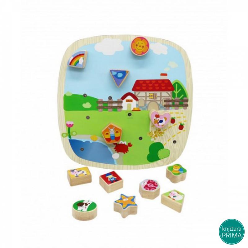 Igračka kojom se igraju mala i velika deca istovremeno. učenje pojmova vežbe fine motorike razvoj preciznosti pokreta učenje brojeva brojevnog niza učenje gledanja na sat kvalitetno drvo fina obrada sigurne ivice i boje dvostrana tabla za igru postolje i 12 drvenih elemenata dimenzije: 245 x 24 5 x 6 cm za decu: 18 m + Pino Umetaljka Sat sa magnetima je igračka koja pruža mnogo benefita deci uzrasta od 18 meseci i starijoj. Najmlađi drugari uz ovu umetaljku mogu učiti pojmove (koji se sreću na farmi) boje vežbati finu motoriku i preciznost pokreta umetajući elemente u udubljenja određenih oblika ili spajajući ih sa metalnim delovima na podlozi. Pojmovi koji su ilustrovani u udubljenjima i na elementima za umetanje su tematski povezani i motivišu dete na razmišljanje i povezivanje ovih pojmova usput gradeći trajno znanje o njima (gusenica-leptir krava-mleko…). Malo starija deca mogu učiti pojedinačne brojeve i brojevni niz kako se brojevi izgovaraju na engleskom jeziku (ispisani nazivi u udubljenjima) i nazive oblika elemenata za umetanje (srce krug trougao zvezda…).