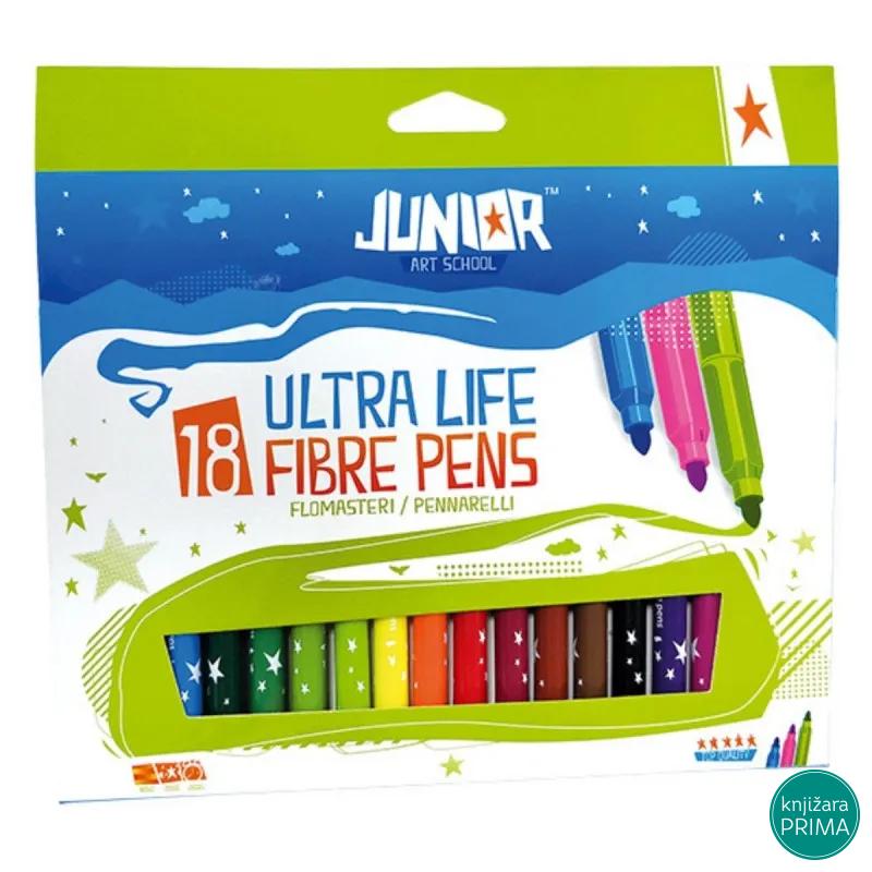 Flomasteri Junior Ultra Life pakovanje od 18 komada. Telo flomastera je okruglo, ostavljaju postojan trag i mastilo se lako pere sa većine tkanina.