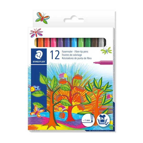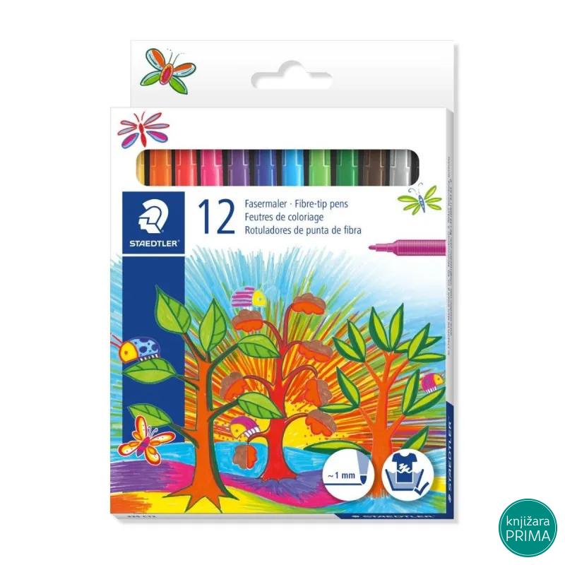 Flomasteri Staedtler 12 komada u kartonskoj kutiji. Mastilo se lako pere sa većine tekstila. Širina linije pribl. 1,0 mm . Sjajni za crtanje i pisanje.