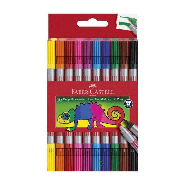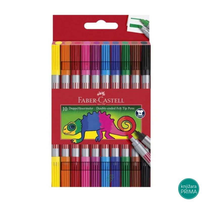 Školski flomasteri visokog kvaliteta brenda Faber Castell. U pakovanju se nalazi 10 flomastera jarkih boja idealnih za crtanje i bojenje, a svaki flomaster ima dve različite boje.