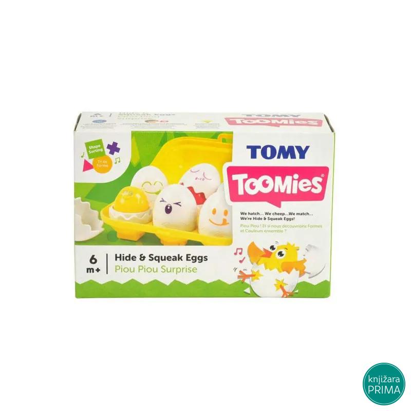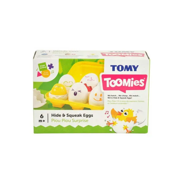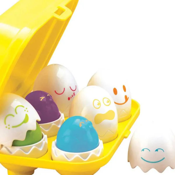 Tomy muzička jaja najsmjanih i simpatičnih lica idealna su za mališane uzrasta od 6 meseci. Karton sadrži 6 mesta za 6 Tomy muzičkih jaja i svako dno ima ulegnuće određenog oblika kome odgovara samo ono jaje koje na svom dnu ima isti takav ispupčeni oblik. Kada se skine poklopac jajeta u vidu ljuske ispod se krije jedno od 6 raznobojnih jaja kome odgovara poklopac sa crtežom lica u boji u kojoj je i jaje. Prtiskom na jaje čuje se simpatično pijukanje što deci čini igru zabavnijom. Kroz igru mališani razvijaju logičke sposobnosti unapređuju pažnju stimulišu pamćenje i uče boje i oblike. Podstaknite razvoj vašeg deta i unapredite njegove sposobnosti i to kroz igru uz Tomy muzička jaja. Uzrast: 6+ meseci Materijal: plastika Dimenzije pakovanja: 14 x 21 x 8 cm Set sadrži: 1 karton za jaja i 6 muzičkih jaja. Detaljnije