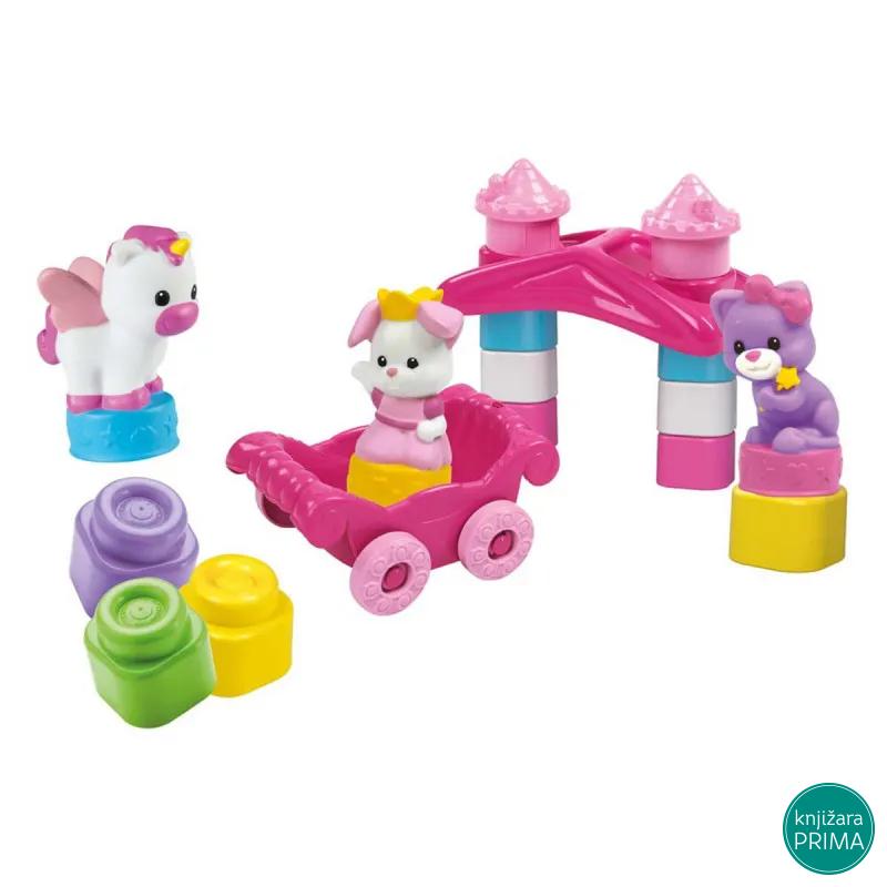 Slatki set stiže pravo iz čarobnog sveta princeza! Uz pregršt mekih Clemmi kockica tu su 3 figure i fantastični dodaci - podstaknite Vašu princezu da sagradi dvorac i smisli nove avanture jednorogu zeki i maci. Stimuliše ručnu spretnost finu motoriku i maštu kod najmladjih. Uzrast: 6-36 meseci Materijal: plastika karton Dimenzije: 7 x 45 x 31 cm Set sadrži: 19 delova 3 figure i kočiju . Detaljnije