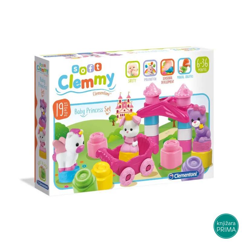 Slatki set stiže pravo iz čarobnog sveta princeza! Uz pregršt mekih Clemmi kockica tu su 3 figure i fantastični dodaci - podstaknite Vašu princezu da sagradi dvorac i smisli nove avanture jednorogu zeki i maci. Stimuliše ručnu spretnost finu motoriku i maštu kod najmladjih. Uzrast: 6-36 meseci Materijal: plastika karton Dimenzije: 7 x 45 x 31 cm Set sadrži: 19 delova 3 figure i kočiju