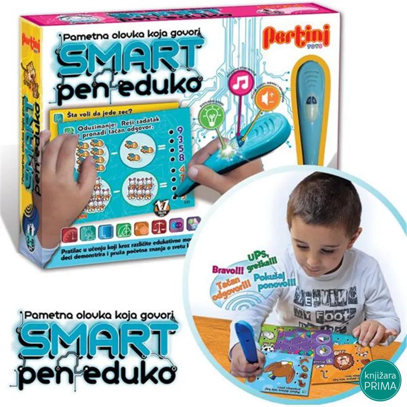 SMART PEN EDUKO - sa pametnom olovkom koja komentariše odgovore. Interaktivno pronalaženje i rešavanje odgovora na zadate teme i zadatke! 100 edukativnih lekcija 8 različitih tema ( VREME ŽIVOTINJE ZANIMLJIVA MATEMATIKA SKUPOVI OBLICI - PREPOZNAVANJE - UOČAVANJE VOĆE UPORE?IVANJE ) 3 funkcije olovke ( GOVORI SVIRA I SVETLI ) Uzrast: 3-6 godina . Detaljnije