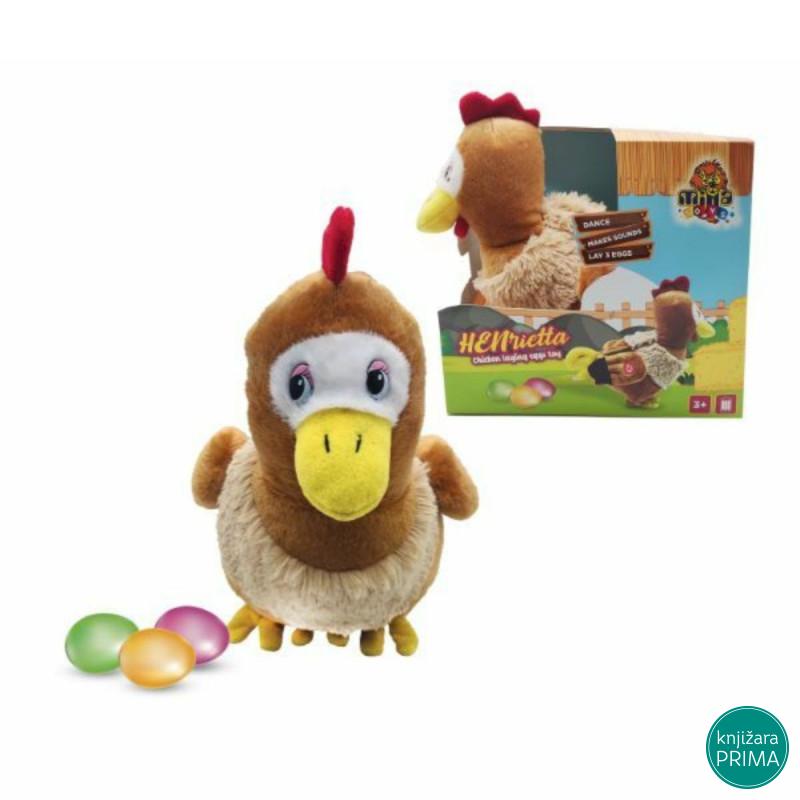 Plišana kokoška pritiskom na taster peva i igra, a uz to polaže i 3 plastična jajeta.