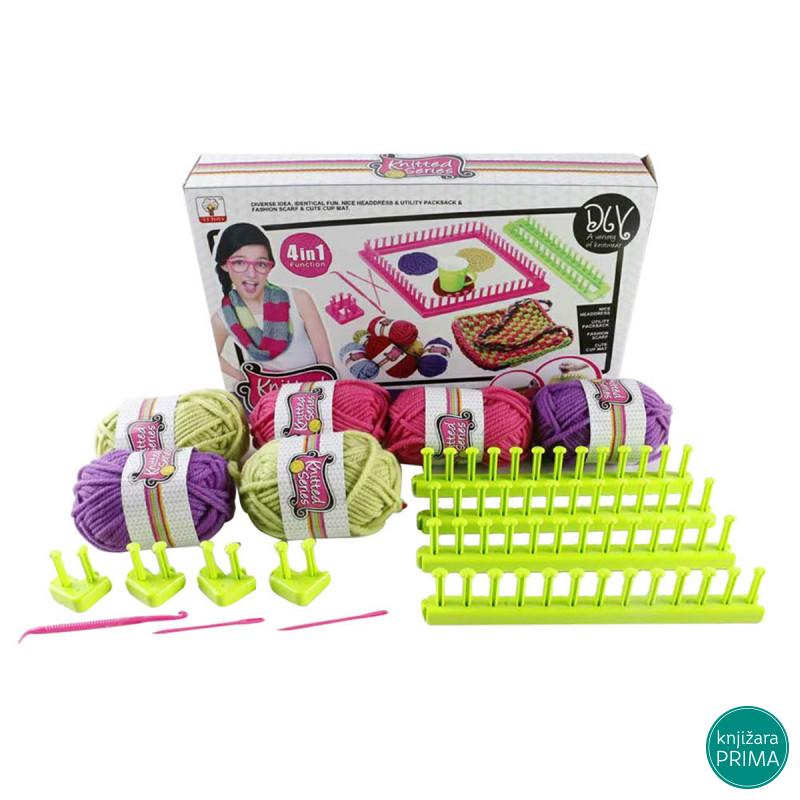 Kreativni set za pletenje za decu. Sadržaj seta: 6 vunica 3 plastične igle za pletenje delovi za sklapanje razboja