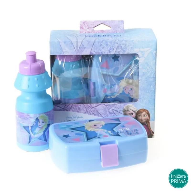 Lunch box kutija za užinu i flašica Frozen set Dimenzije: 18.6 x 18.6 x 7.3 cm Težina: 187g Materijal: plastika (PE PP TPR) Sadržaj: kutija za užinu i flašica