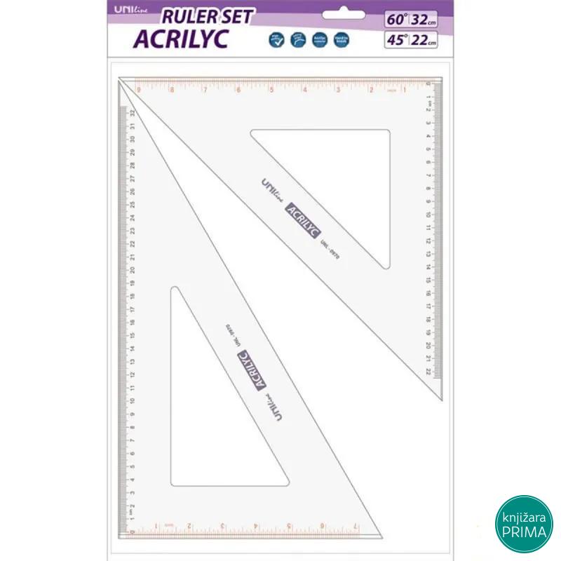 Trouglovi su izrađeni od akril materijala. To je vrsta termoplastičnog materijala novi tip plastike koji ima visoku transparentnost malu težinu otpornost na habanje otpornost na padove i druga odlična svojstva. U setu se nalaze dva pravougla trougla sa precizno pozicioniranim detaljima jedan ima najdužu katetu 32cm a drugi 22cm.. Detaljnije