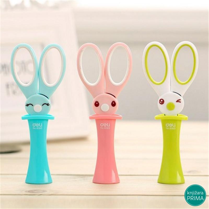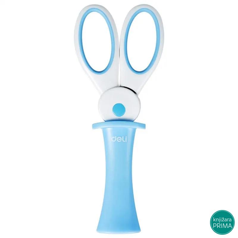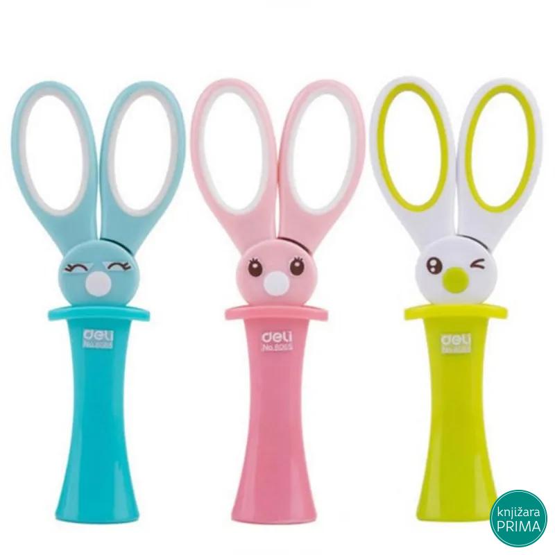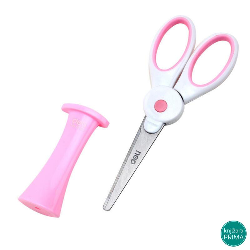Dečije makazice sa sečenje papira brenda DELI. Makazice dolaze sa zaštitnim poklomcem.