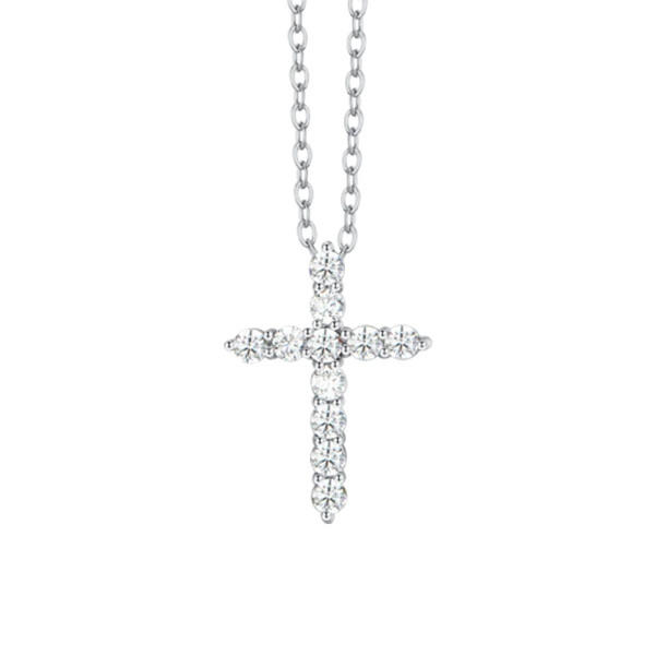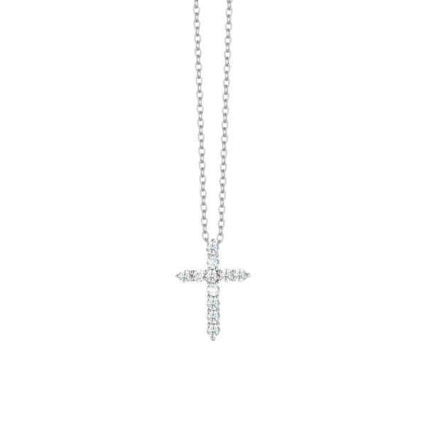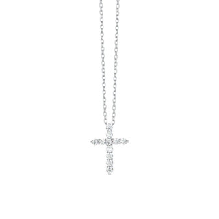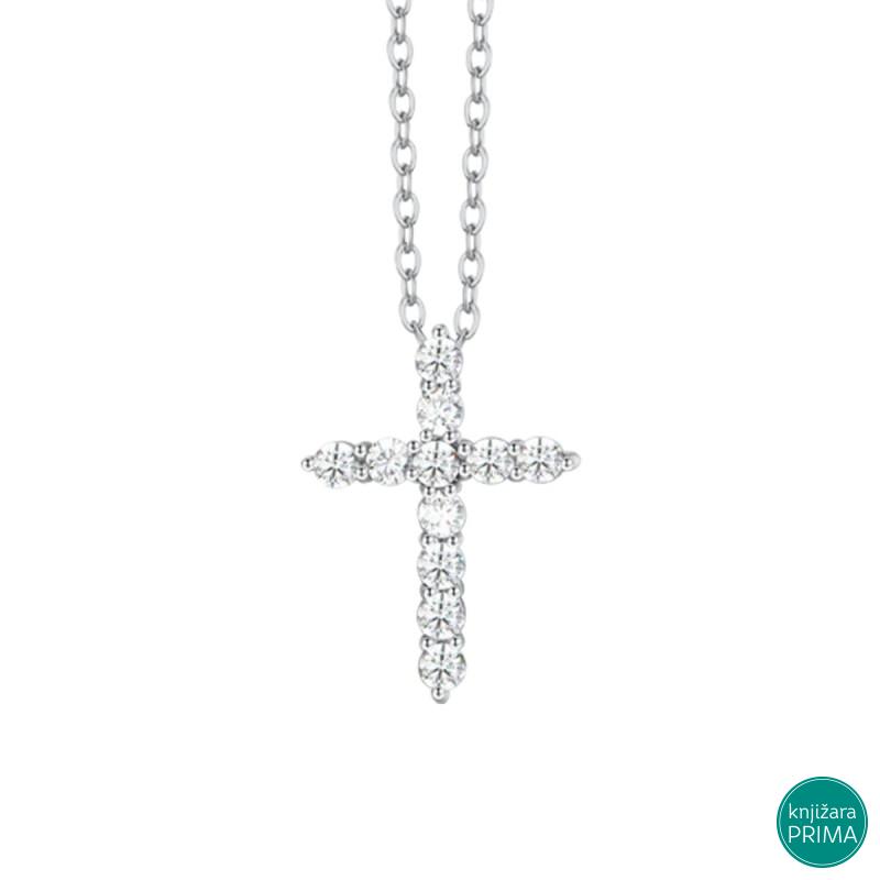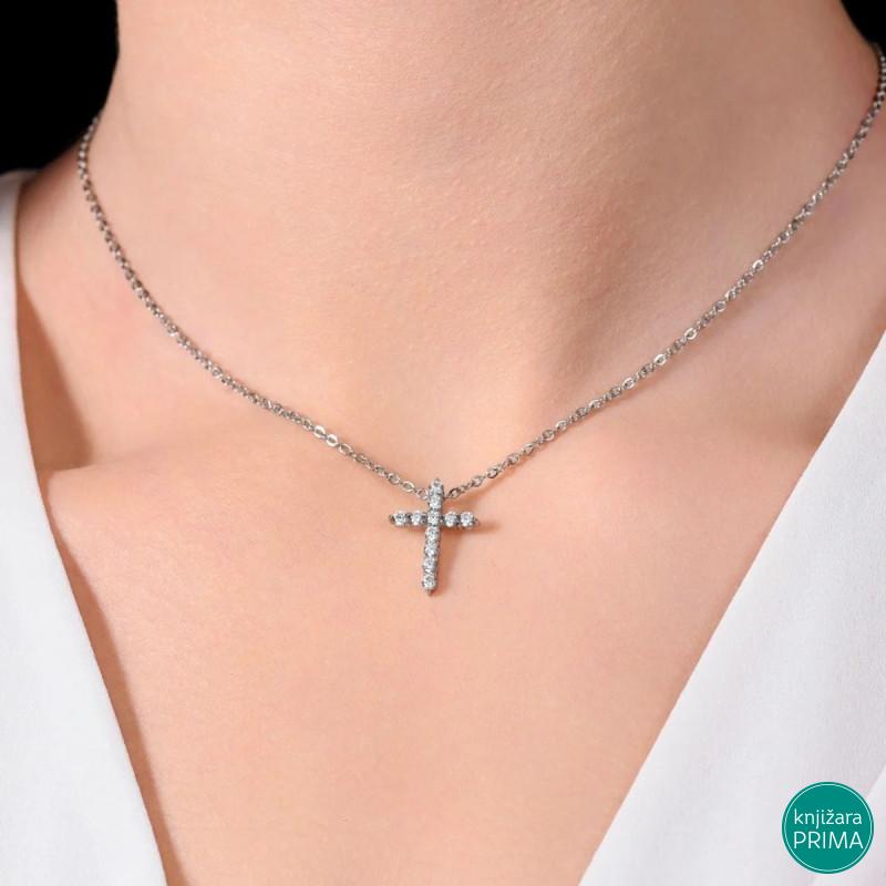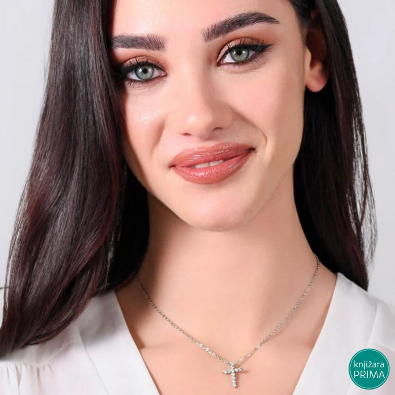 Ženski čelični lančić sa priveskom u obliku krsta, ukrašen belim kubnim cirkonima. Dužina: 40 + 5 cm. Veličina krsta: 15 x 20 mm. Prečnik cirkona: 2 mm. Debljina lančića: 4 mm.