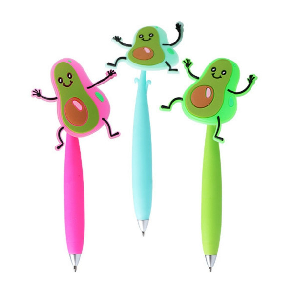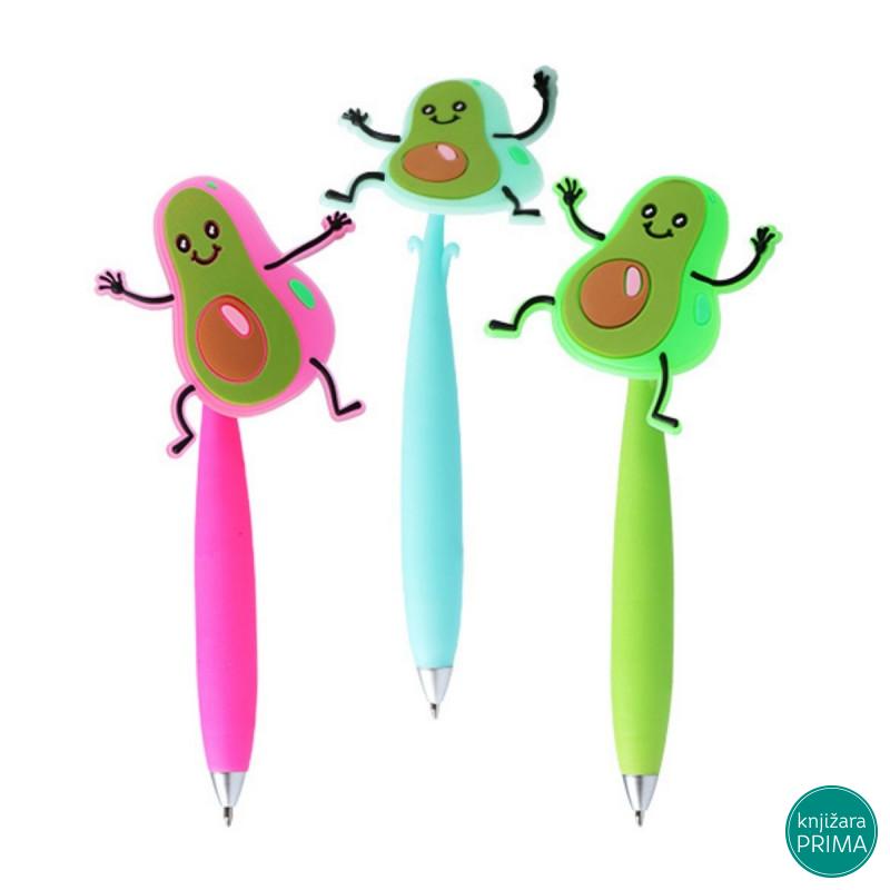 Hemijska olovka sa dekoracijom avokada na vrhu. Olovka je plastična sa plavom minicom.