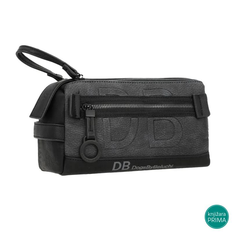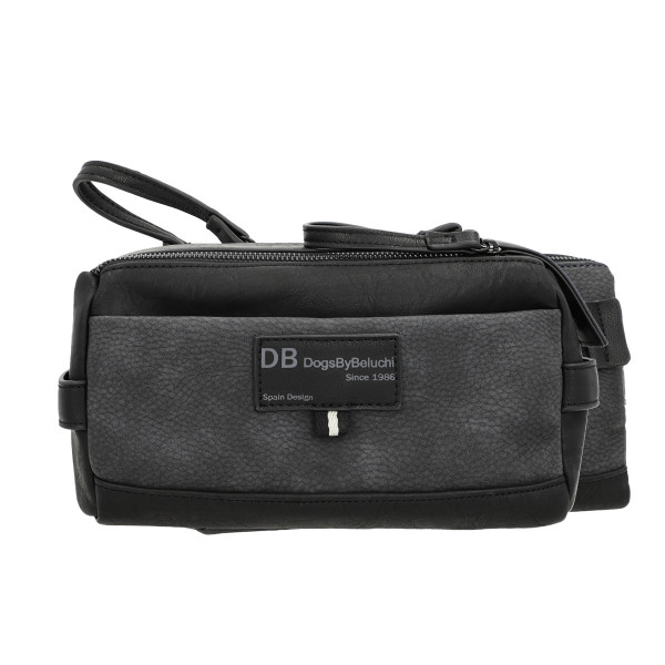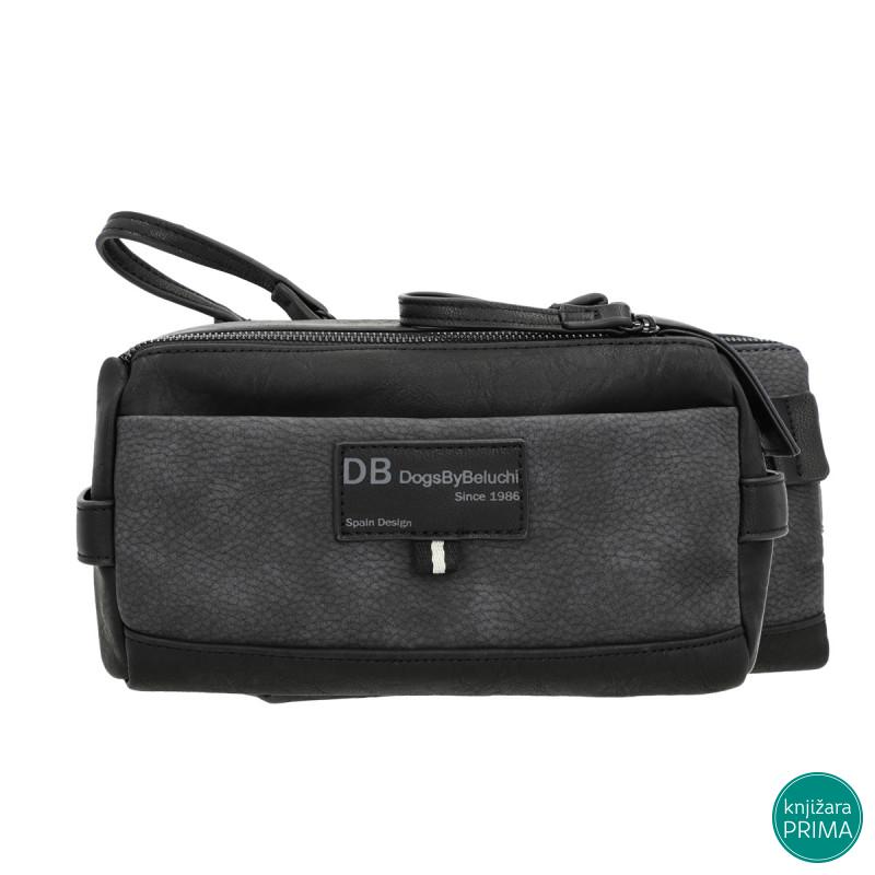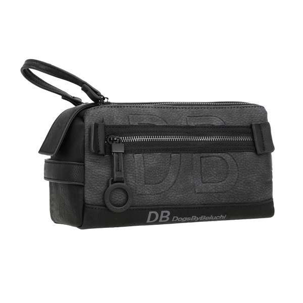 Muški neseser brenda Dogs By Beluchi, izrađen od eko kože u tamno sivoj boji, prostran, sa puno manjih pregrada i kaišem za kačenje. Idealan za putovanja.