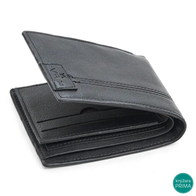 Klasičan muški preklopni novčanik sa pregradom za papirni novac, kao i dosta odeljaka za kartice i lična dokumenta.