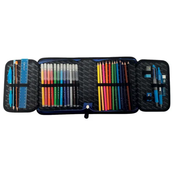 U pernici se nalazi 35 komada pribora: 12 flomastera, 12 drvenih bojica, 2 grafitne olovke, rezač, gumica, lenjir, hemijska olovka , tehnička olovka i mine 0.5 i 2 rasporeda časova.
