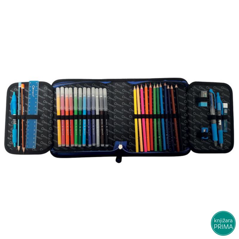 U pernici se nalazi 35 komada pribora: 12 flomastera, 12 drvenih bojica, 2 grafitne olovke, rezač, gumica, lenjir, hemijska olovka , tehnička olovka i mine 0.5 i 2 rasporeda časova.