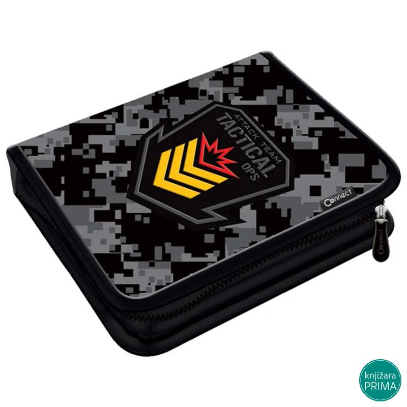 Army pernica puna sa jednim zipom i dva preklopa. U pernici se nalazi 35 komada pribora: 12 flomastera, 12 drvenih bojica, 2 grafitne olovke, rezač, gumica, lenjir, hemijska olovka , tehnička olovka i mine 0.5 i 2 rasporeda časova.