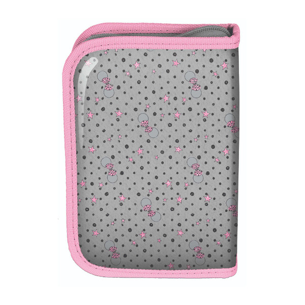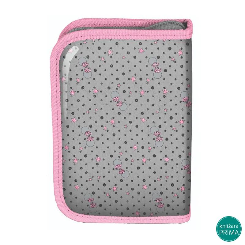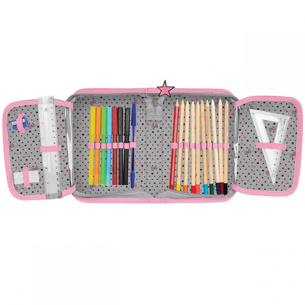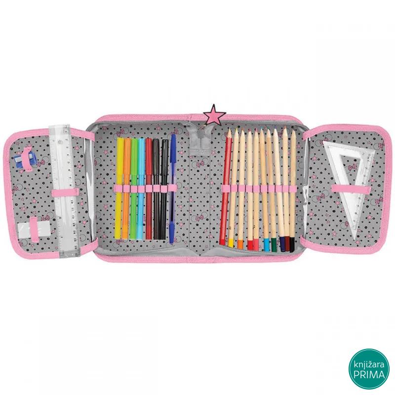 Pernica sa jednim odeljkom na rasklapanje sa dva unutrašnja poklopca. Pernica sadrži: hemijsku olovku, grafitnu olovku, 7 flomastera, 9 bojica, rezač, gumicu, lenjir, trougao, tablicu množenja i raspored časova.
