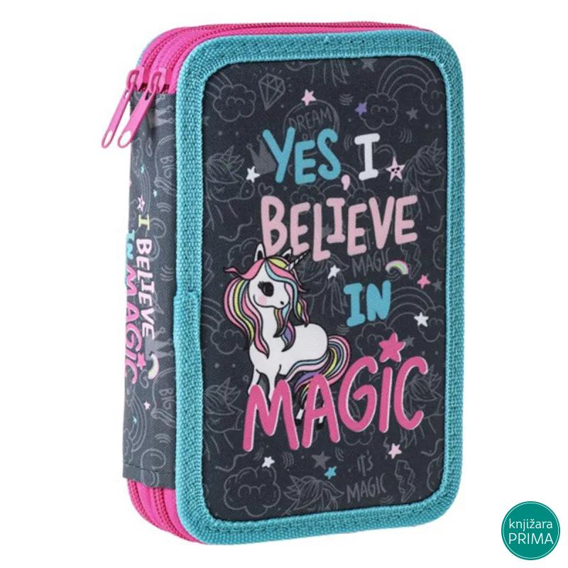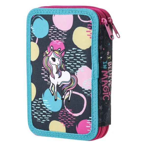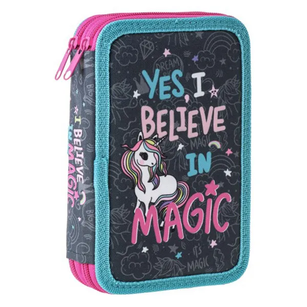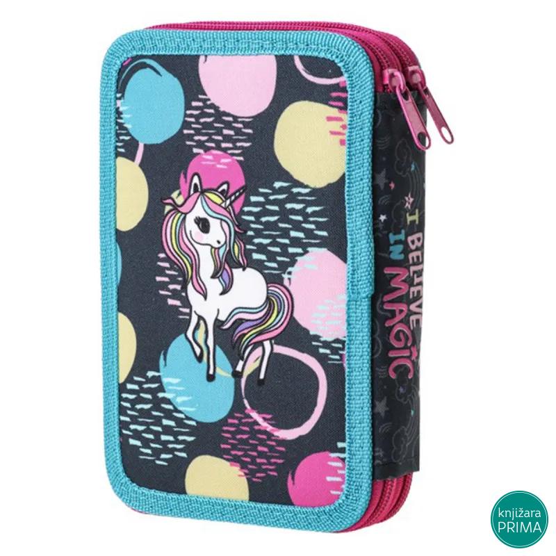 Puna pernica PLAY 2 zipa - Unicorn magic ističe se originalnim dizajnom i izrađena je od visokokvalitetnog materijala. Punjena je školskim priborom i sadrži: 12 Sazio drvenih bojica, 12 Sazio flomastera, 2 grafitne olovke, 2 hemijske olovke, rezač, gumicu i lenjir.