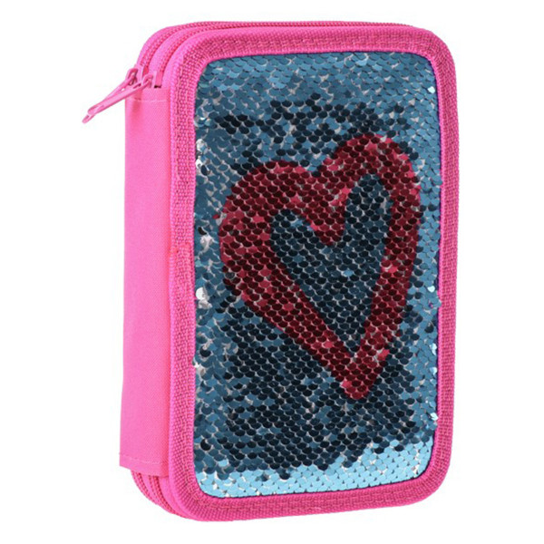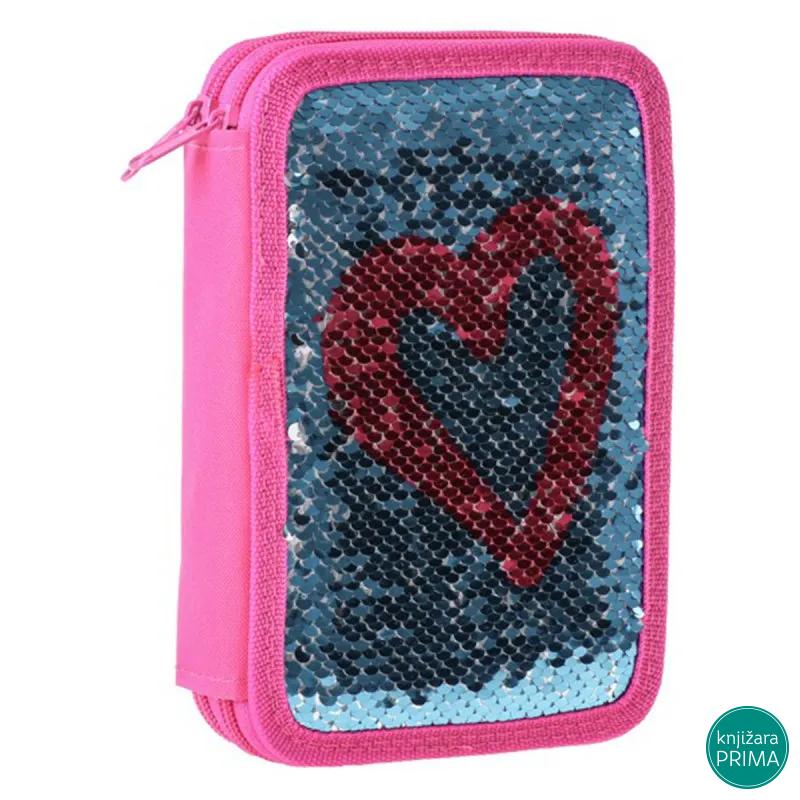 Puna pernica PLAY 2 zipa - Heart piši-briši ističe se originalnim dizajnom i izrađena je od visokokvalitetnog materijala. Punjena je školskim priborom i sadrži: 12 Sazio drvenih bojica, 12 Sazio flomastera, 2 grafitne olovke, 2 hemijske, olovke, rezač, gumicu i lenjir.
