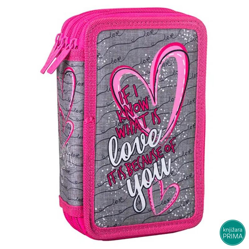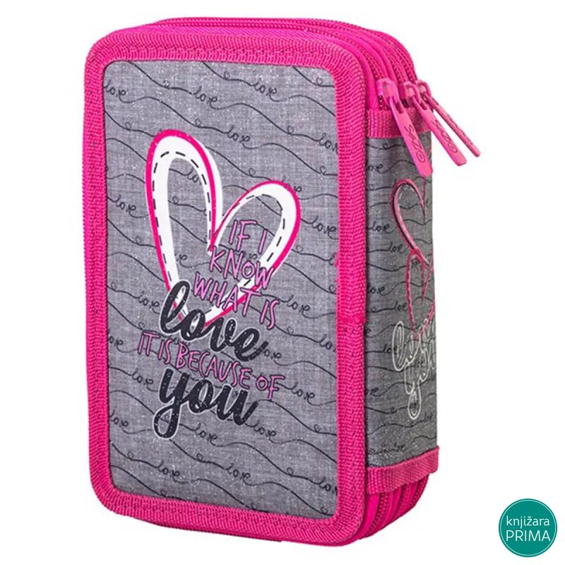 Puna pernica PLAY 3 zipa - Because of you ističe se originalnim dizajnom i izrađena je od visokokvalitetnog materijala. Punjena je školskim priborom i sadrži:18 drvenih bojica, 18 flomastera, 2 grafitne olovke, 2 hemijske olovke, rezač, gumicu i lenjir.