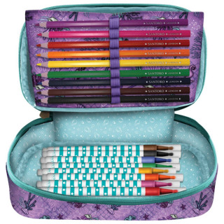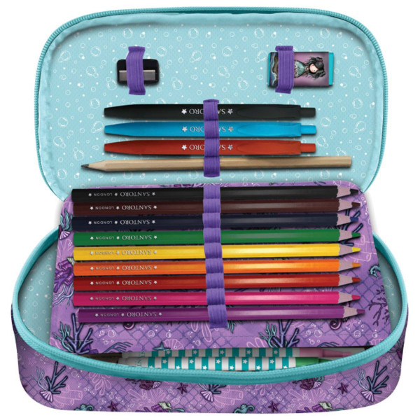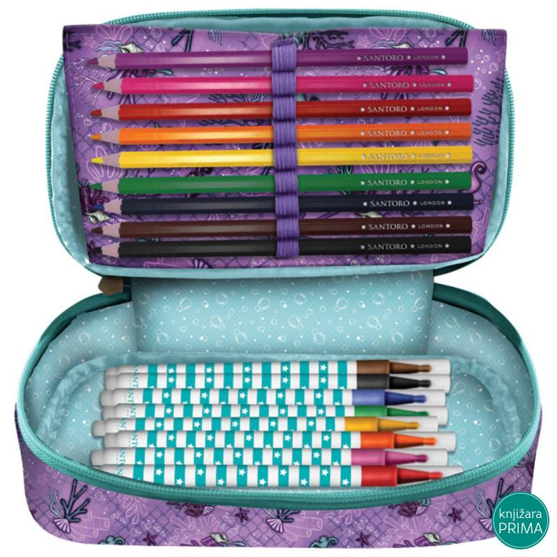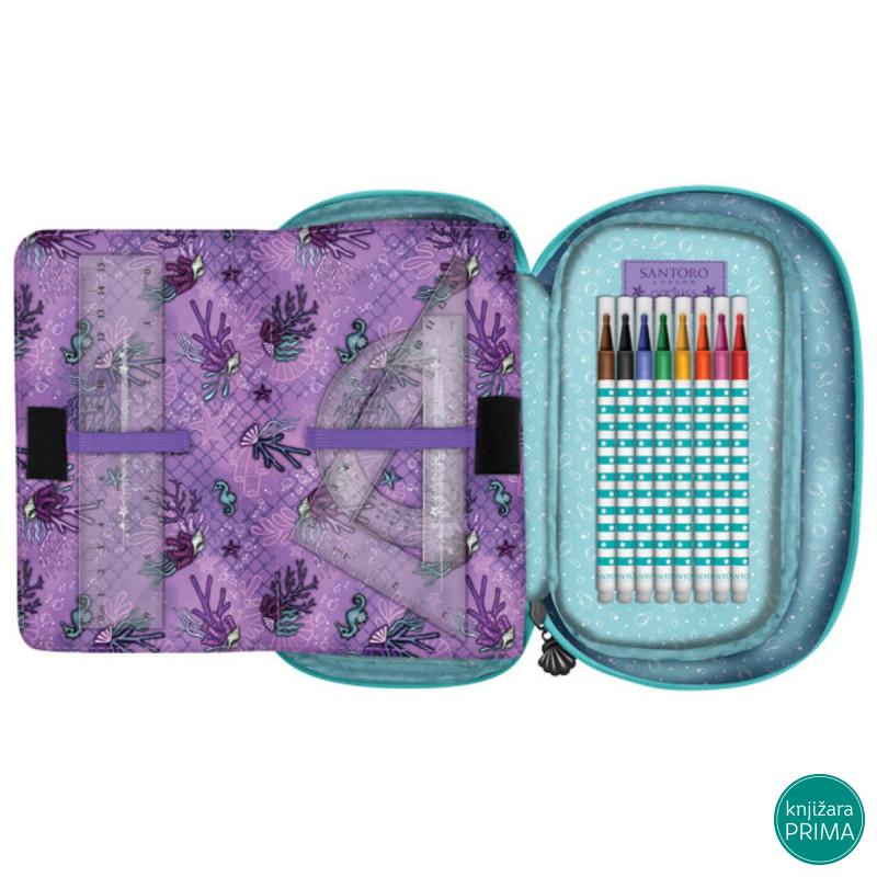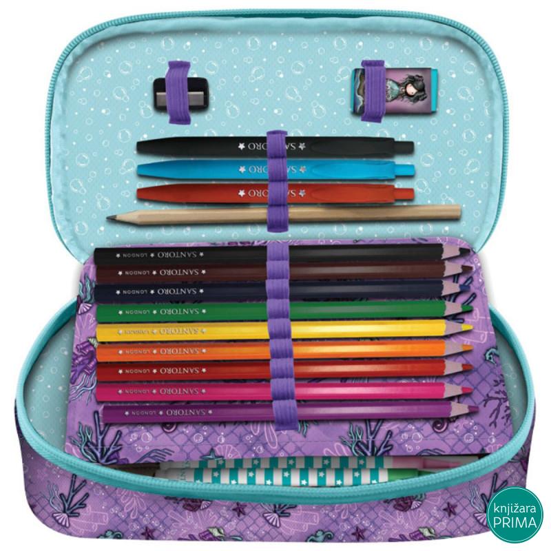 pernica puna; pravougaona; 1 zip, 1 preklop; punjena sa 45 komada pribora: flomaster školski 18 boja, boje drvene 18 boja, olovka grafitna HB, rezač, gumica, lenjir 15 cm, trougao; uglomer 180° pvc i olovka hemijska x 3 komada (crna, crvena i plava); dimenzija: 22x12,5x6,5 cm