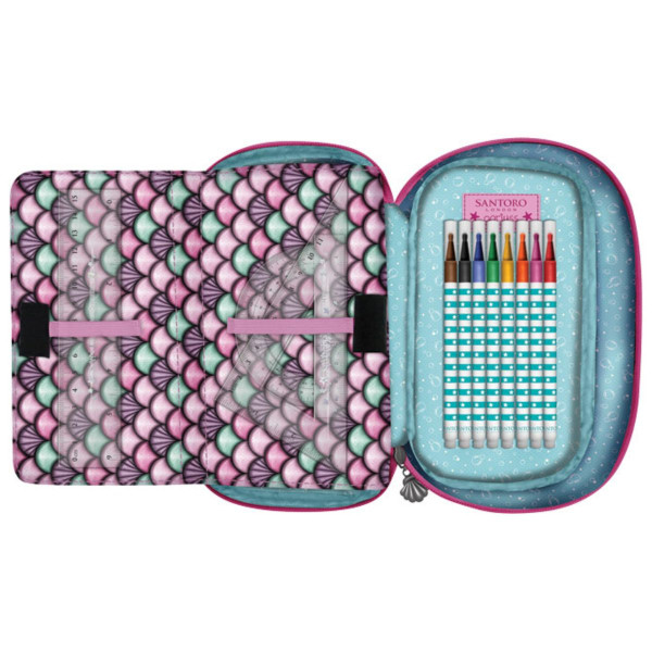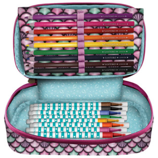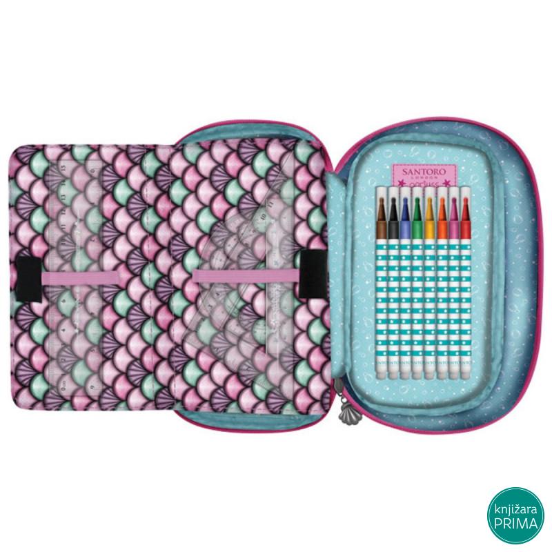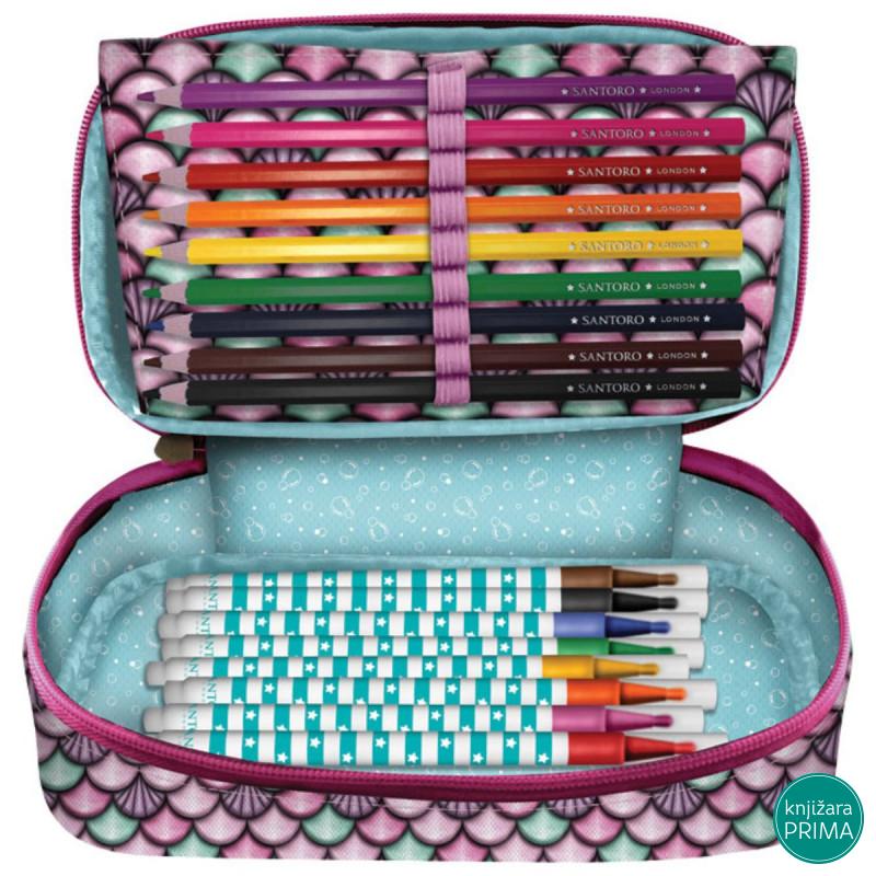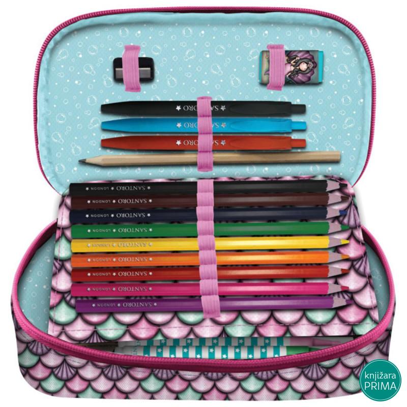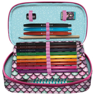 pernica puna; pravougaona; 1 zip, 1 preklop; punjena sa 45 komada pribora: flomaster školski 18 boja, boje drvene 18 boja, olovka grafitna HB, rezač, gumica, lenjir 15 cm, trougao; uglomer 180° pvc i olovka hemijska x 3 komada (crna, crvena i plava); dimenzija: 22x12,5x6,5 cm