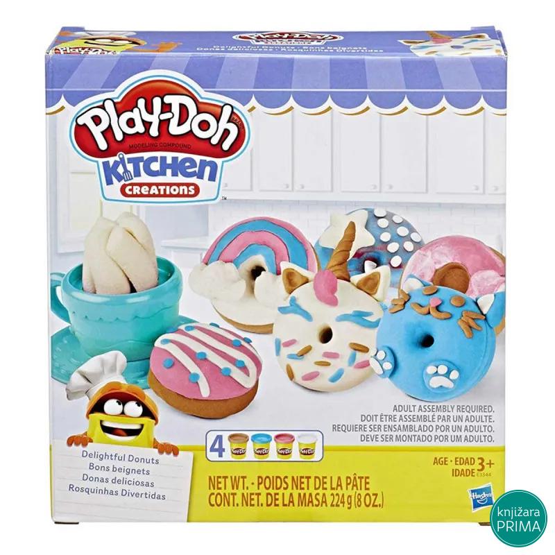 Zatvori okice i zamisli najlepše krofnice! Da li su to krofnice u svim duginim bojama? Jednorog krofnica? Pahuljica krofnica? Mačkasta krofnica? Napravi nam svoju krofnicu iz snova! Izaberi boju stavi kuglicu u modlu onda napravi rupicu i ukrasi filom i šarenim mrvicama! Poredjaj ih na tacnicu i posluži uz šolju bele kafe sa puuuno šlaga! Uzrast: 3+ godine Materijal: plastika masa za modelovanje na bazi pšeničnog brašna karton Dimenzije: 65 x 20 x 22 cm Set sadrži: izložbeni štand za izlaganje krofnica modlu alat za rupicu fil-špric šolju i tacnicu 4 kantice Play Doh-a i kartice sa idejama
