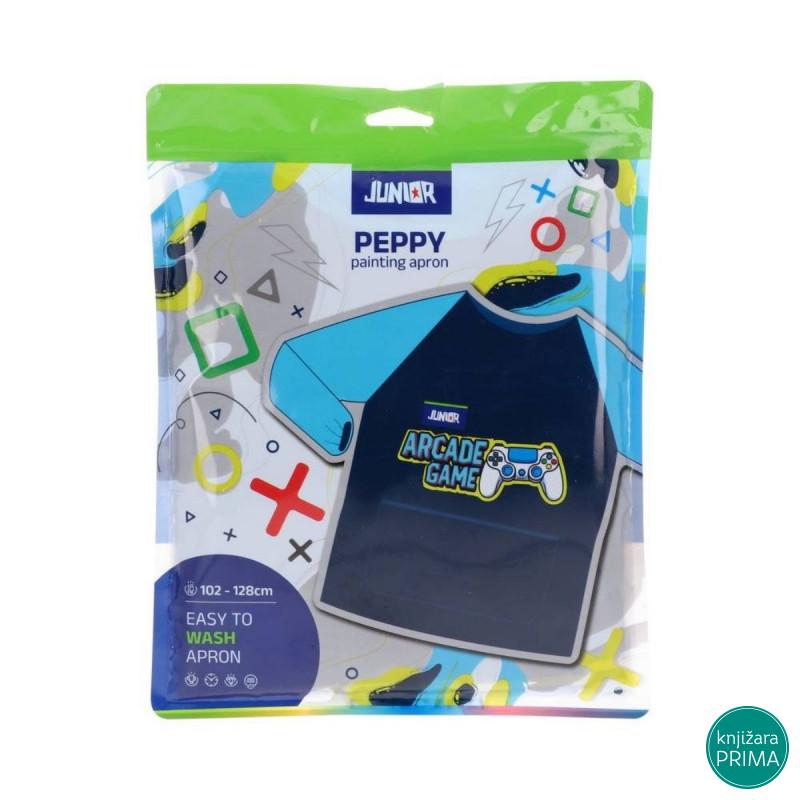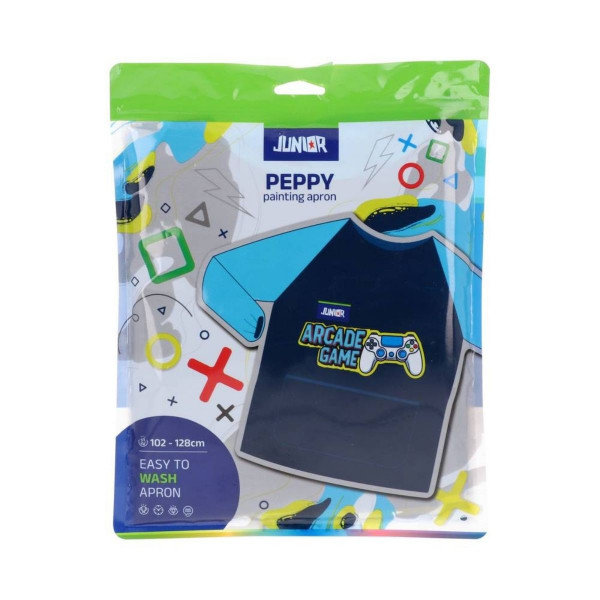 Kecelja za likovno namenjena za decu visine od 102cm do 128cm. Napravljena je od vodootpornog materijala, mekanog i lakog za čišćenje. Prednji i zadnji deo su napravljeni od PEVA materijala, a rukavi od poliestera. Lako se oblači i svlači preko garderobe i poseduje čičak traku na leđima.