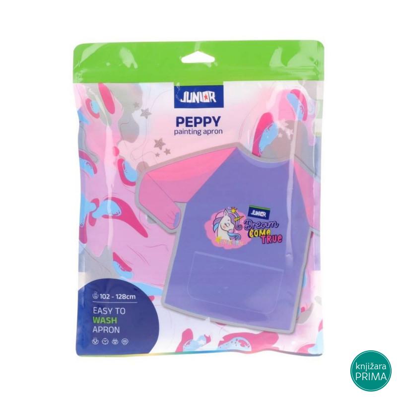 Kecelja za likovno namenjena za decu visine od 102cm do 128cm. Napravljena je od vodootpornog materijala, mekanog i lakog za čišćenje. Prednji i zadnji deo su napravljeni od PEVA materijala, a rukavi od poliestera. Lako se oblači i svlači preko garderobe i poseduje čičak traku na leđima.